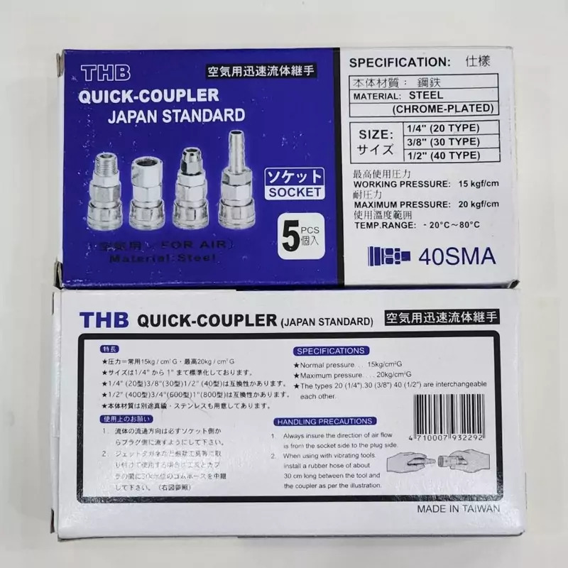 کد 40SMA یکی از مدلهای کوپلینگ پلاگ (Plug) نری برند THB است ویژگیها: نوع اتصال: پلاگ (Plug) نری سایز اتصال: مخصوص شلنگهای قطر داخلی 11 میلیمتر (½ اینچ) جنس: فولاد با روکش کروم (Chrome-Plated Steel) برای مقاومت بالا در برابر خوردگی و سایش استاندارد: ژاپن (Japan Standard) محدوده دمایی: -20°C تا 80°C فشار کاری: 15 کیلوگرم بر سانتیمتر مربع (kgf/cm²) حداکثر فشار: 20 کیلوگرم بر سانتیمتر مربع (kgf/cm²) کاربردها: اتصال سریع شلنگهای هوا در سیستمهای پنوماتیک کارگاههای صنعتی و مکانیکی برای استفاده در ابزارهای بادی تجهیزات خودروسازی و تعمیرگاهی جهت اتصال به دریلهای بادی، آچار بادی، پیستوله رنگ و سایر دستگاههای پنوماتیکی صنایع تولیدی و کارخانهها که از سیستمهای هوای فشرده استفاده میکنند این مدل به عنوان پلاگ نری (Male Plug) شناخته میشود و معمولاً همراه با سوکتهای همسایز مانند 40SHA استفاده میشود. به دلیل کیفیت بالا و استاندارد ژاپنی، در محیطهای صنعتی و حرفهای بسیار پرکاربرد