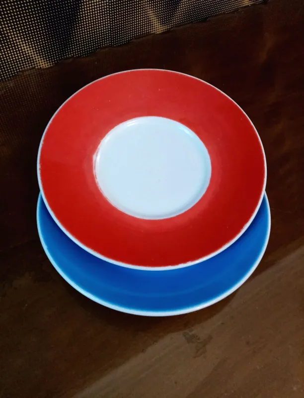 2عدد بشقاب یا کیک خوری کوچک رنگ حلقه ای بسیار کمیاب بازرگانی مسعود در دو رنگ نایاب قرمز و آبی. اندازه قطر 14 سانتیمتر.کاملا سالم.قیمت درج شده برای 1عدد از 2عدد بشقاب موجود میباشد. مناسب دیوارکوب و دکوری.درصورت خرید 1عدد، رنگ مورد نظر خود را ازطریق پیام به ما اعلام فرمایید.