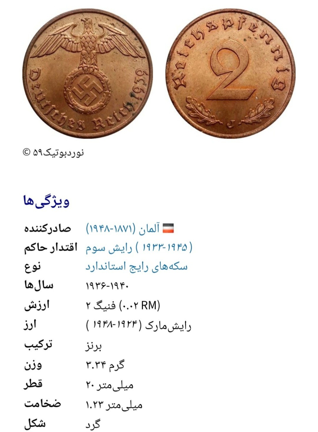 سکه ارزشمند برنزی 2 فنیگ آلمان نازی رایش هیتلر
