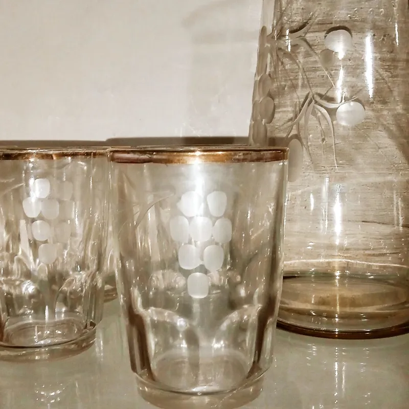 6عدد. لیوان یکعدد پارچ تمام تراش خورده وکار دست نقش انگوری کمیاب
