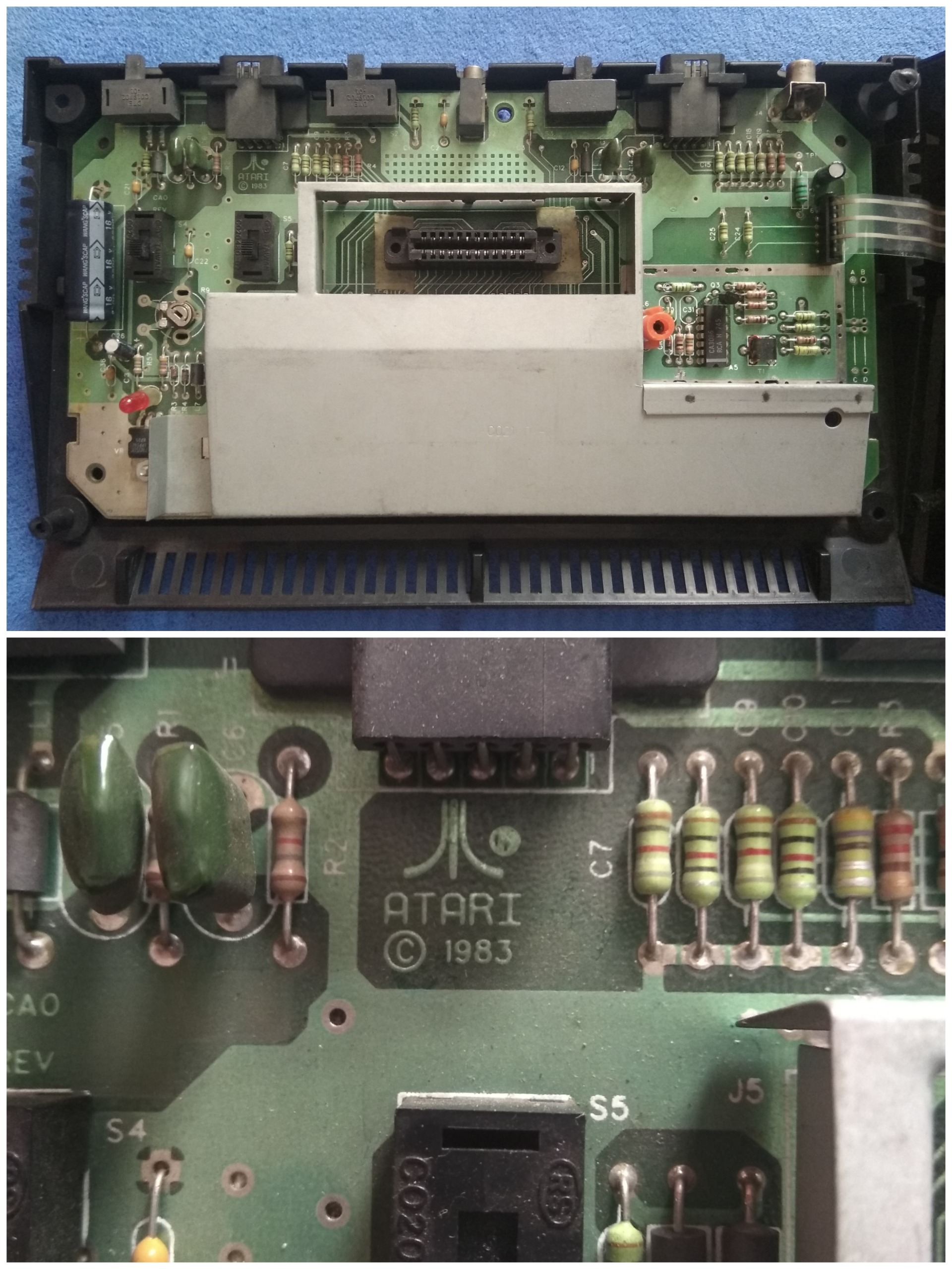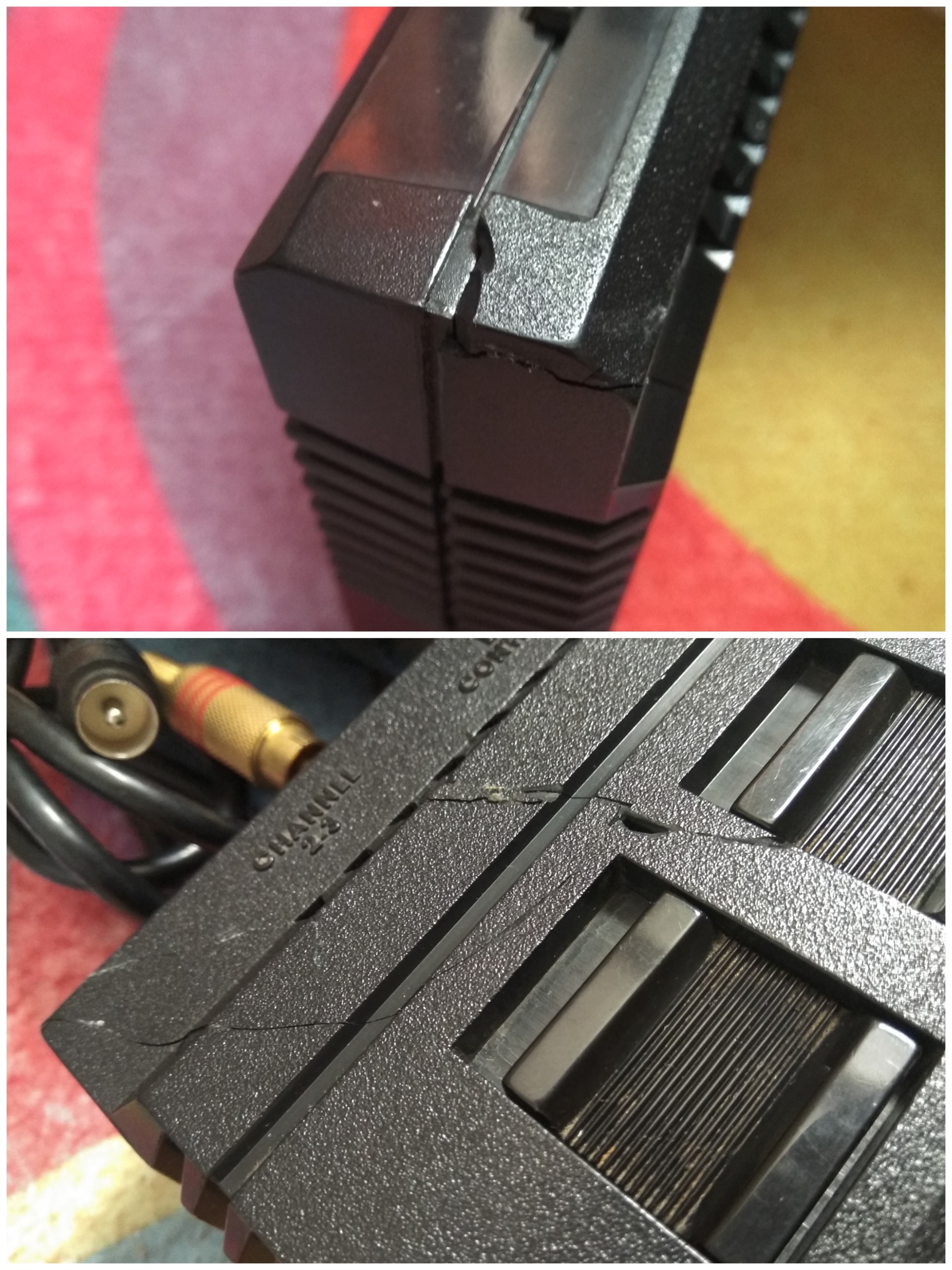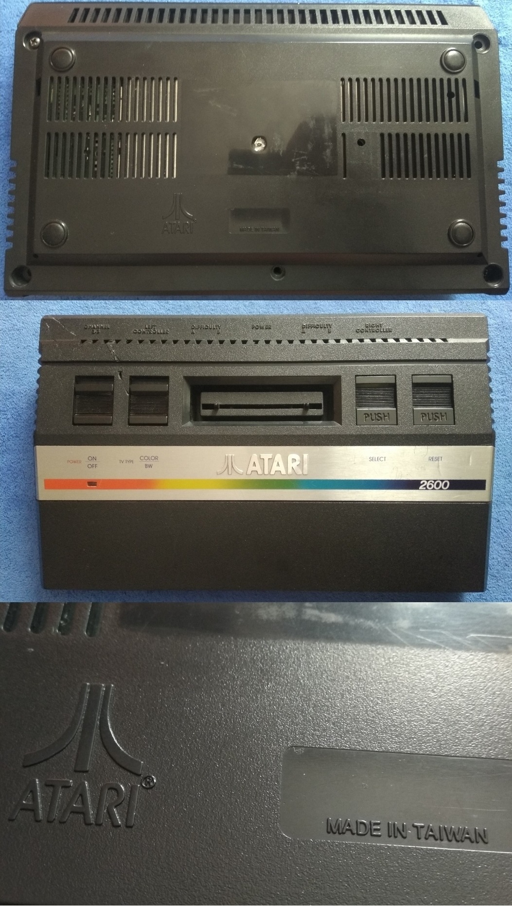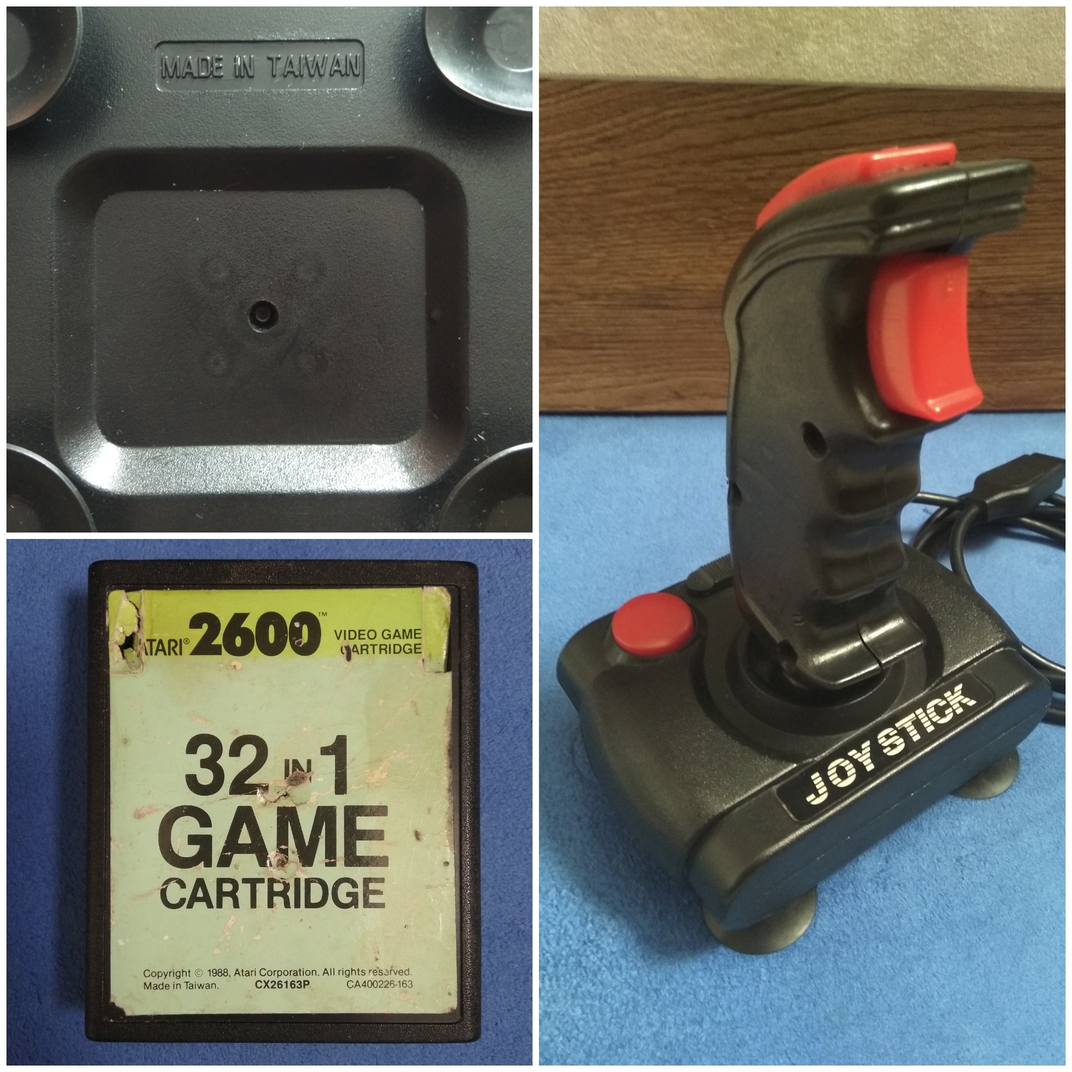 آتاری 2600jr اریجینال معروف به آتاری رنگین کمانی به همراه یک جوی استیک خلبانی تایوانی ، یک کارتریج اریجینال 32 لبه ساخت تایوان و یک کابل RF بدون آداپتور