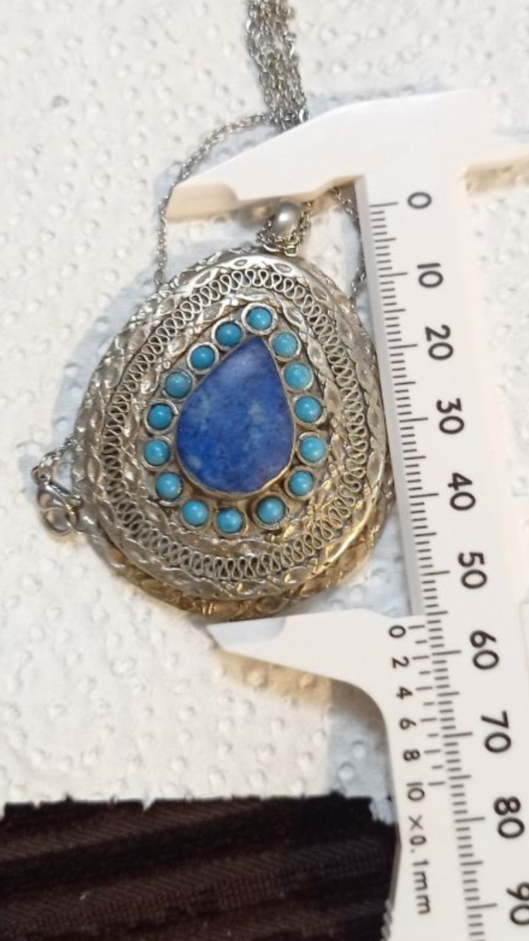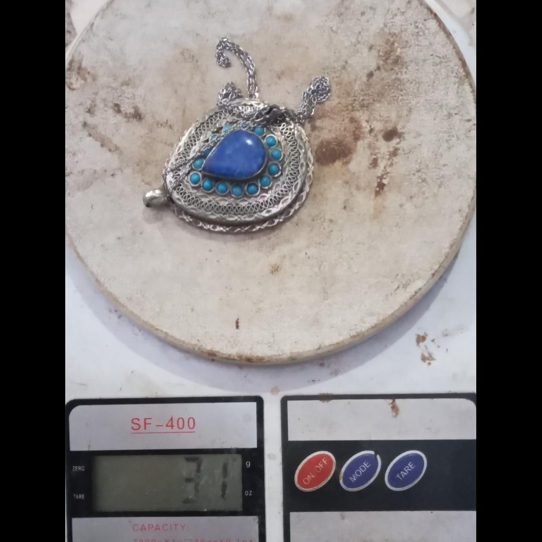 گزدن آویز کهنه بسیار قدیمی حرز دار فیزوزه دورش اصل نیست لاجورد اصلیه کهنه دورشم نقره قدیمی اصالت دار پشتش نقره