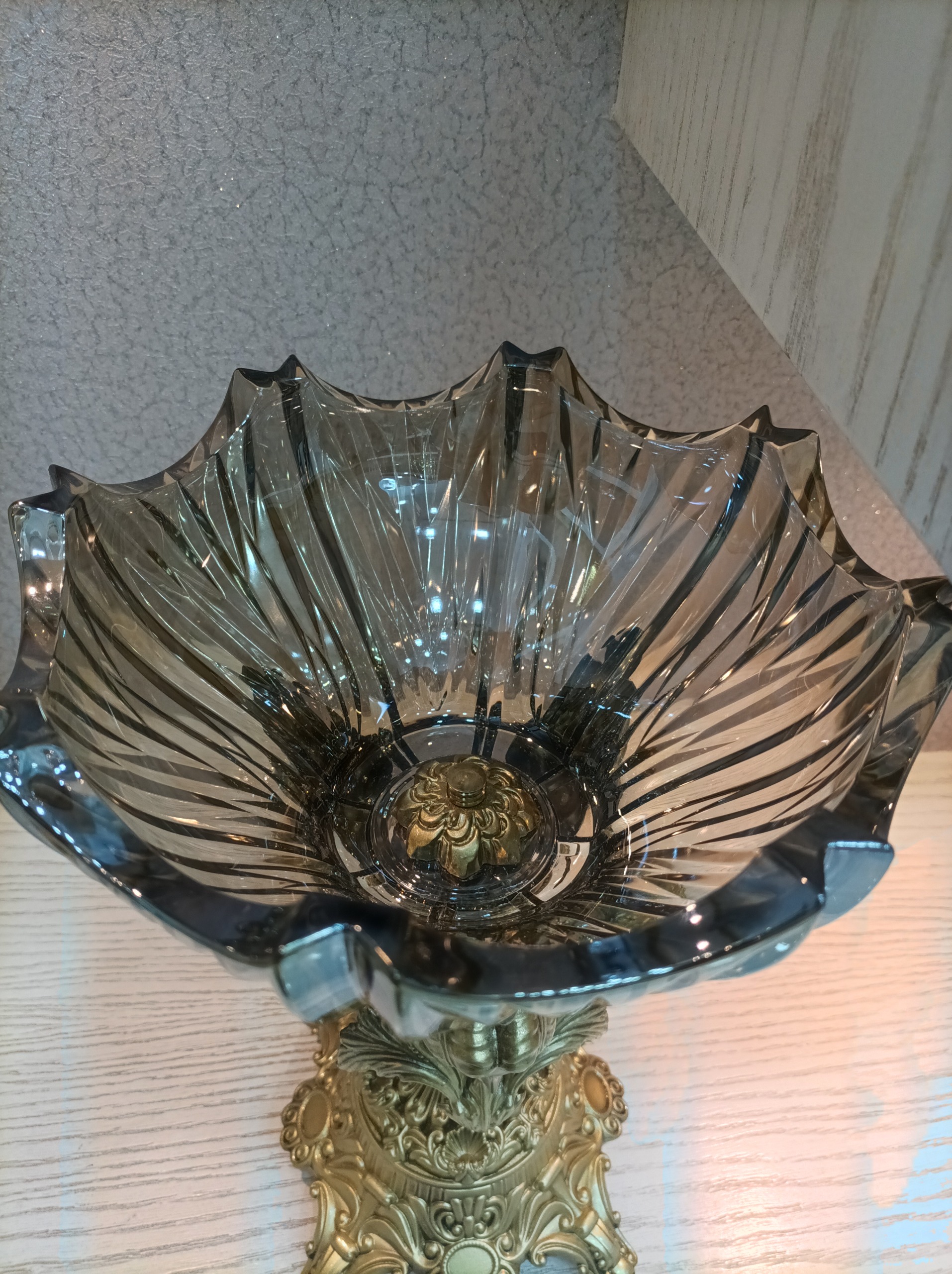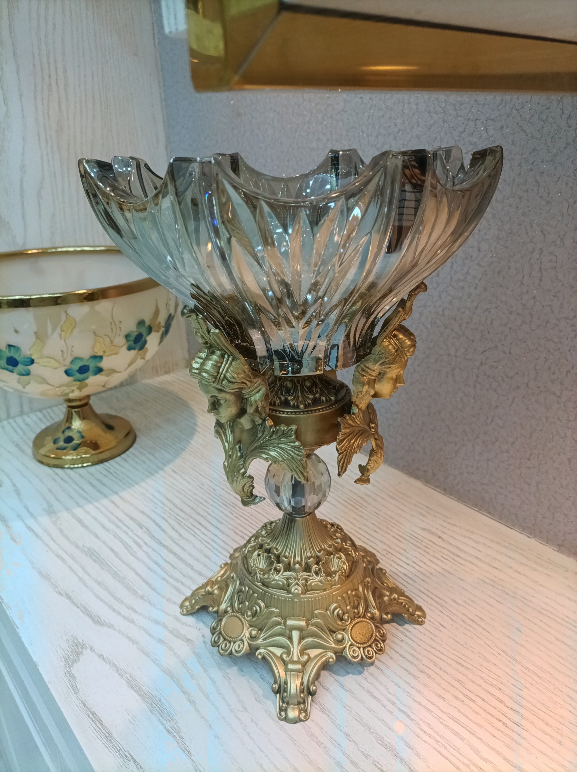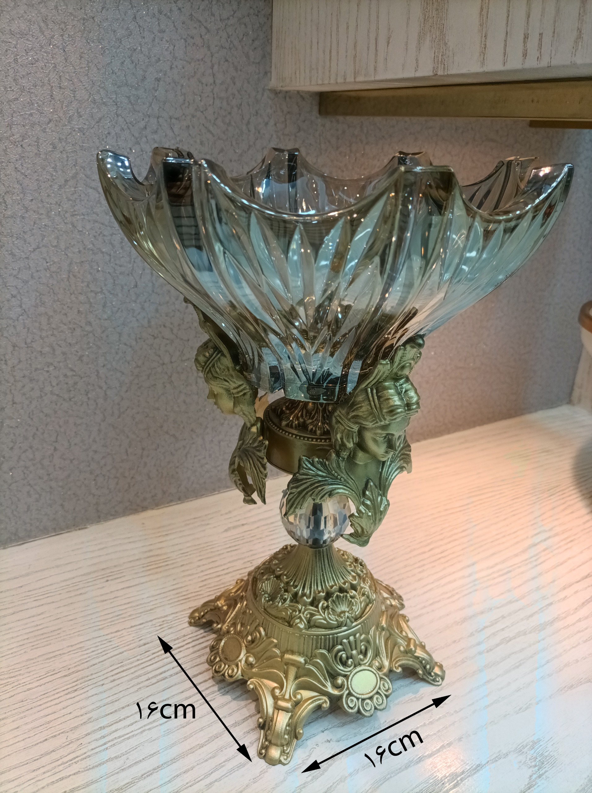 کاسهی کریستالی تراشخوردهی آن، نور را به شکلی چشمنواز منعکس میکند و ترکیبش با پایه طلاییرنگ مجسمهمانند، یادآور هنر کلاسیک و سبک اشرافی اروپایی است.