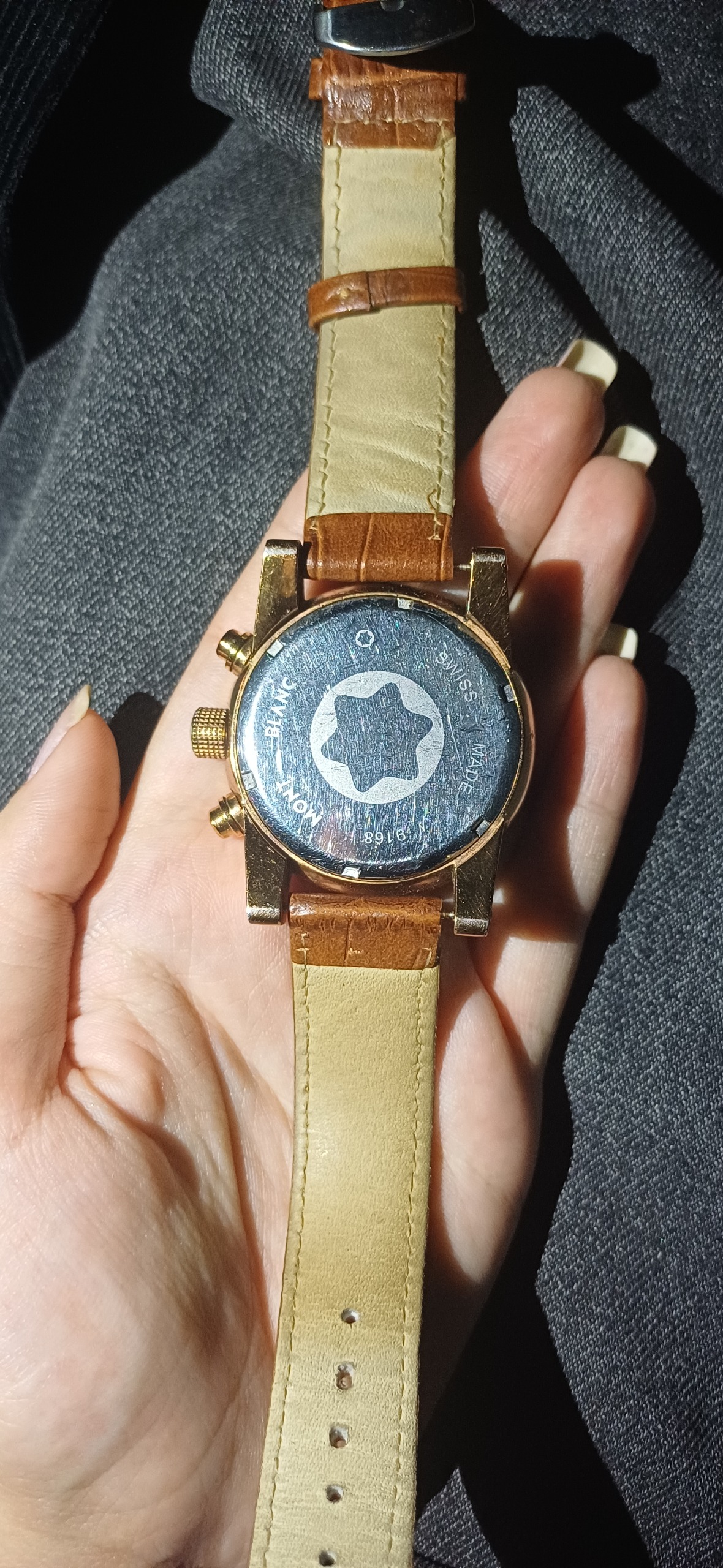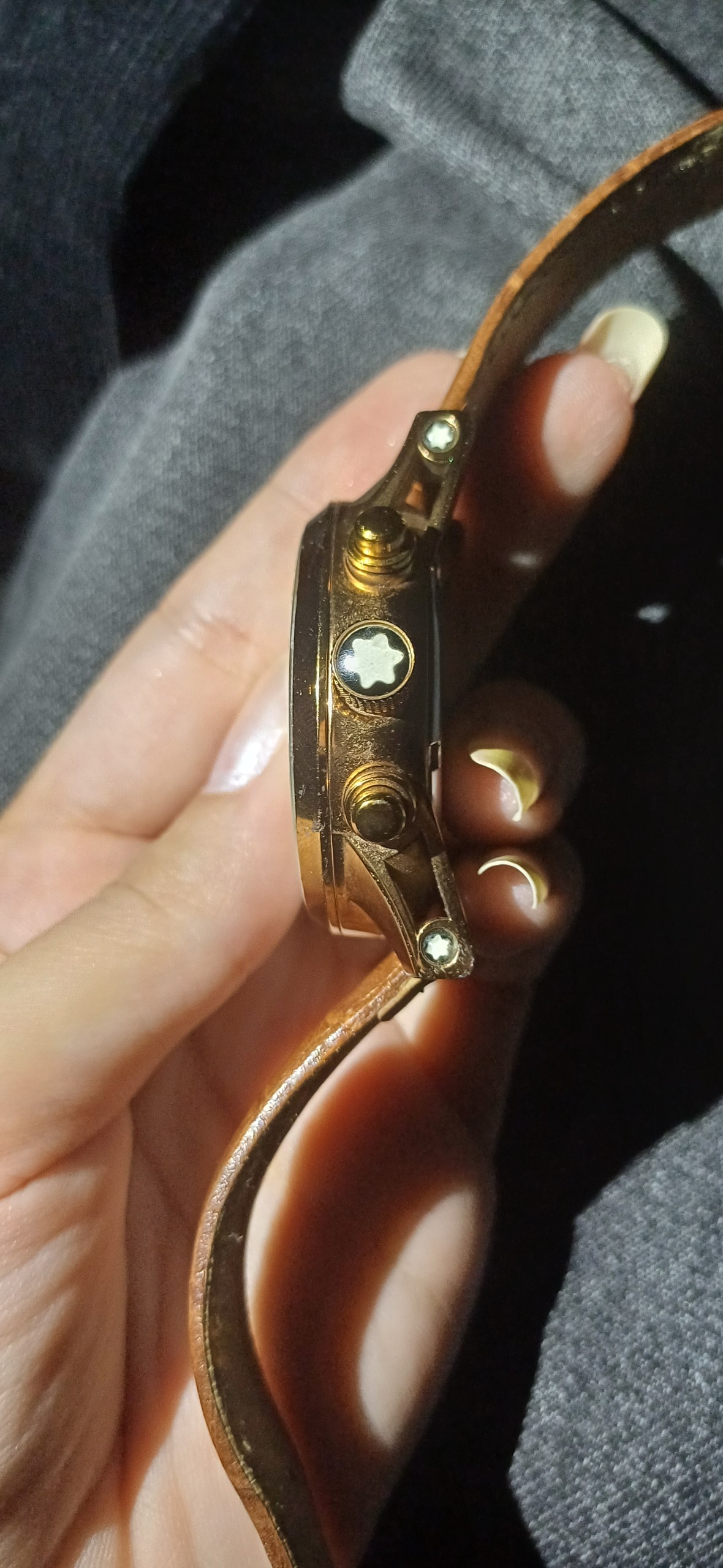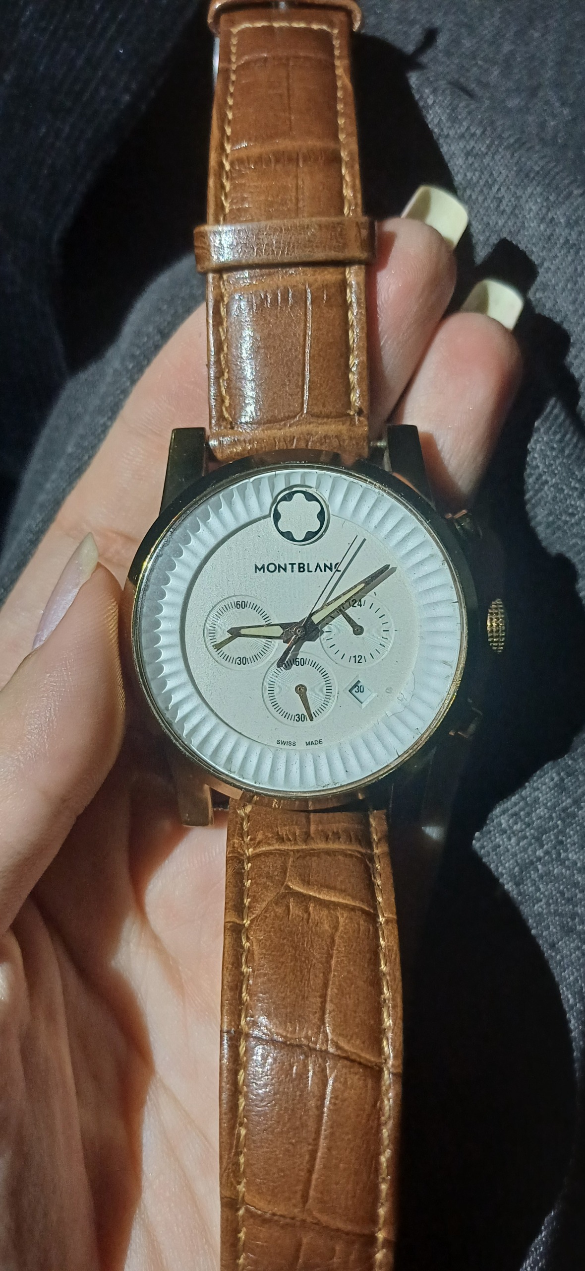 ساعت کرنوگراف مونت بلان سوییس موتور میوتا ژاپن هر سه موتور فعال در حد نو شیشه گوس دار سالم و دقیق کرنو صفر رنگ مسی