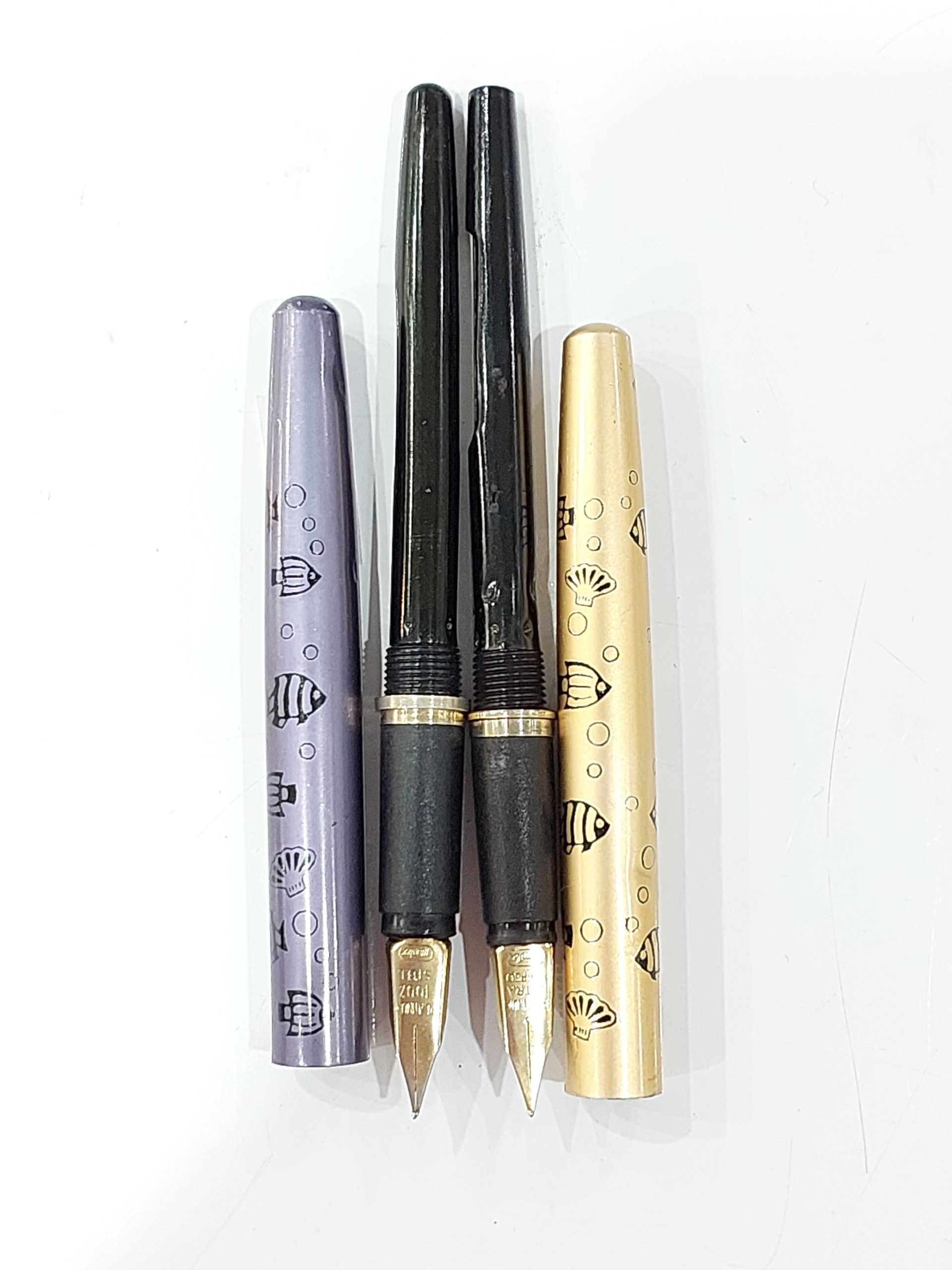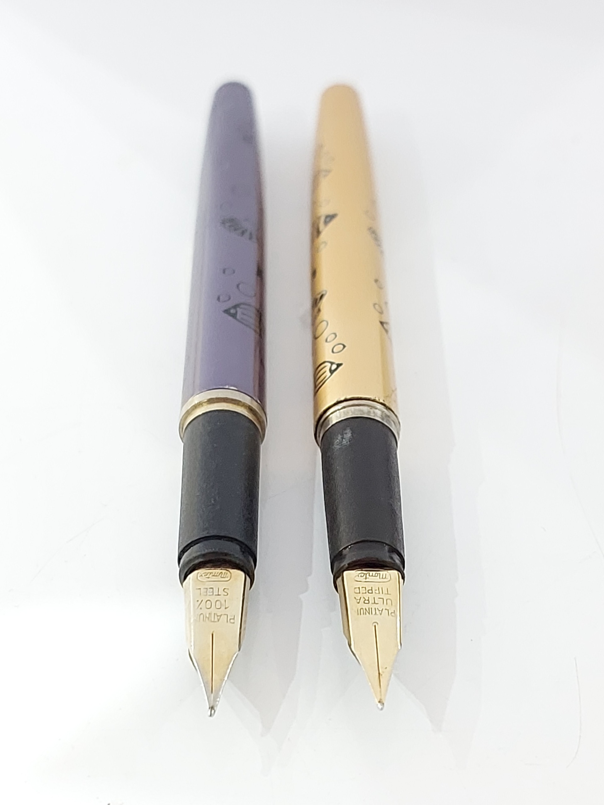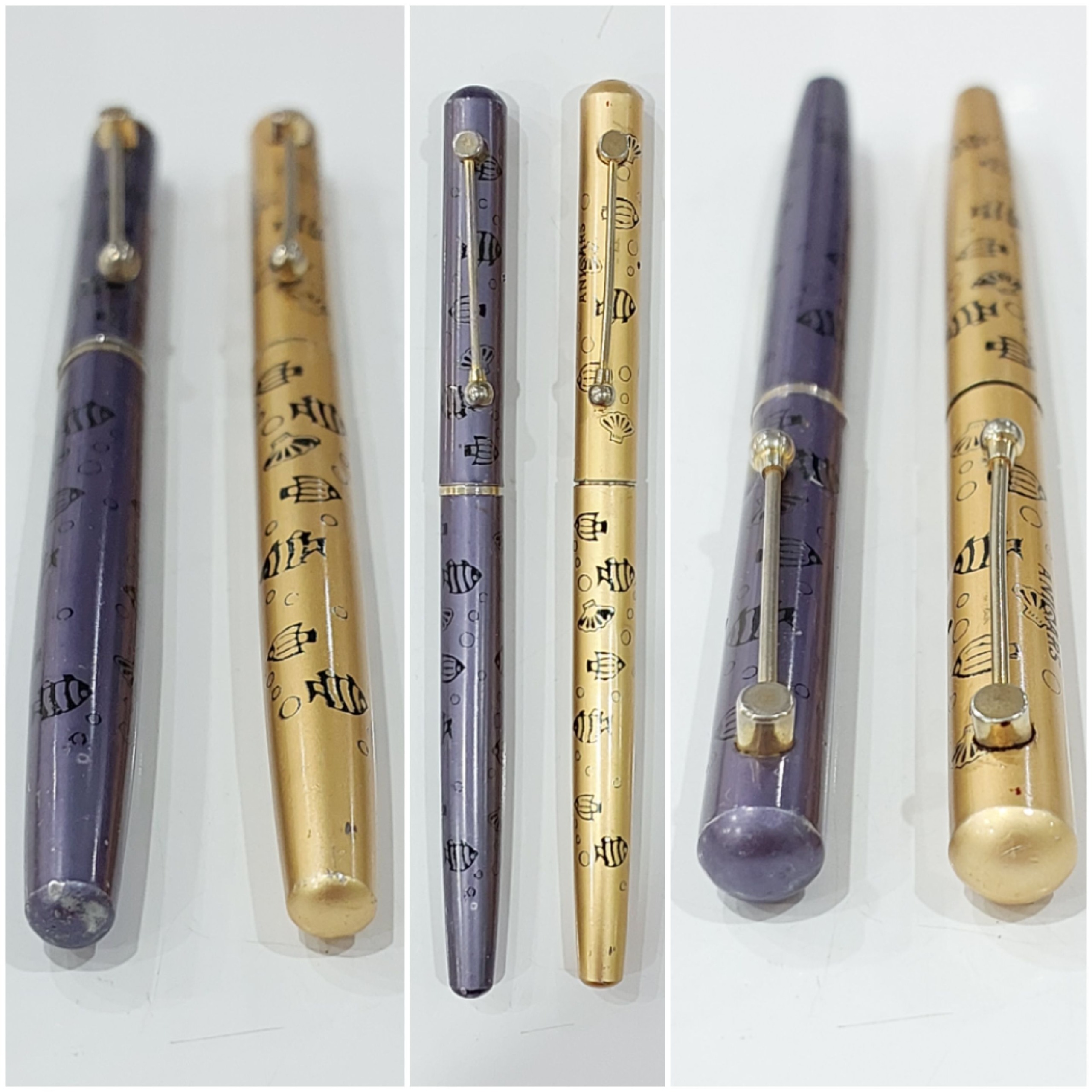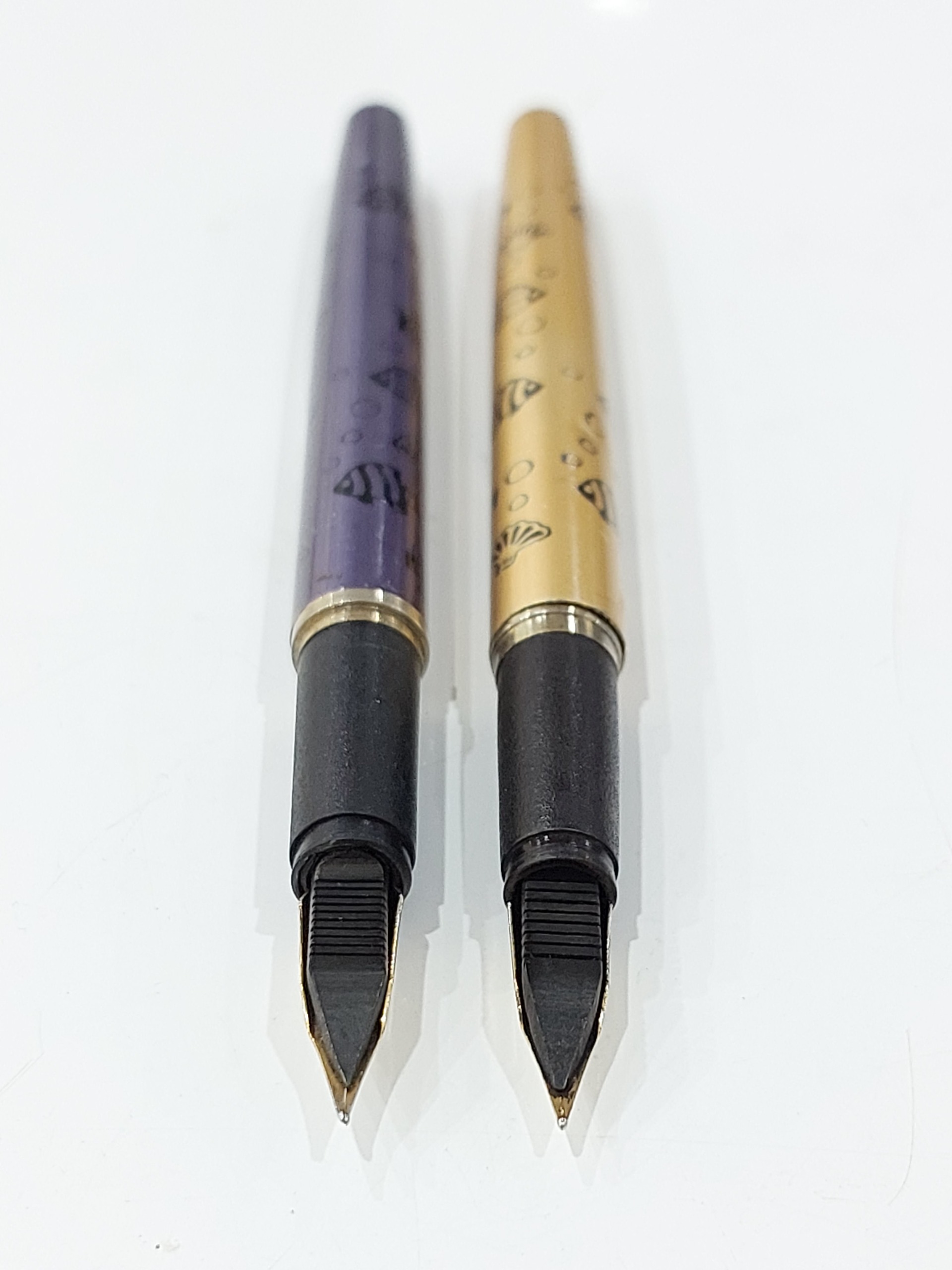 دو عدد خودنویس MONTE چینی اصل با بیش از 30 سال قدمت کمیاب و کلکسیونی، کاملا سالم و تمیز، بسیار زیبا و ارزشمند، خاص و منحصر به فرد میباشند. دارای نوک از جنس پلاتینیوم و پمپ جوهر کاملا سالم، خوش ساخت، خوش دست و خوش استایل همراه با طرح و نقش بسیار خاص میباشند. درپوش خودنویس بنفش کیپ نمیشود.