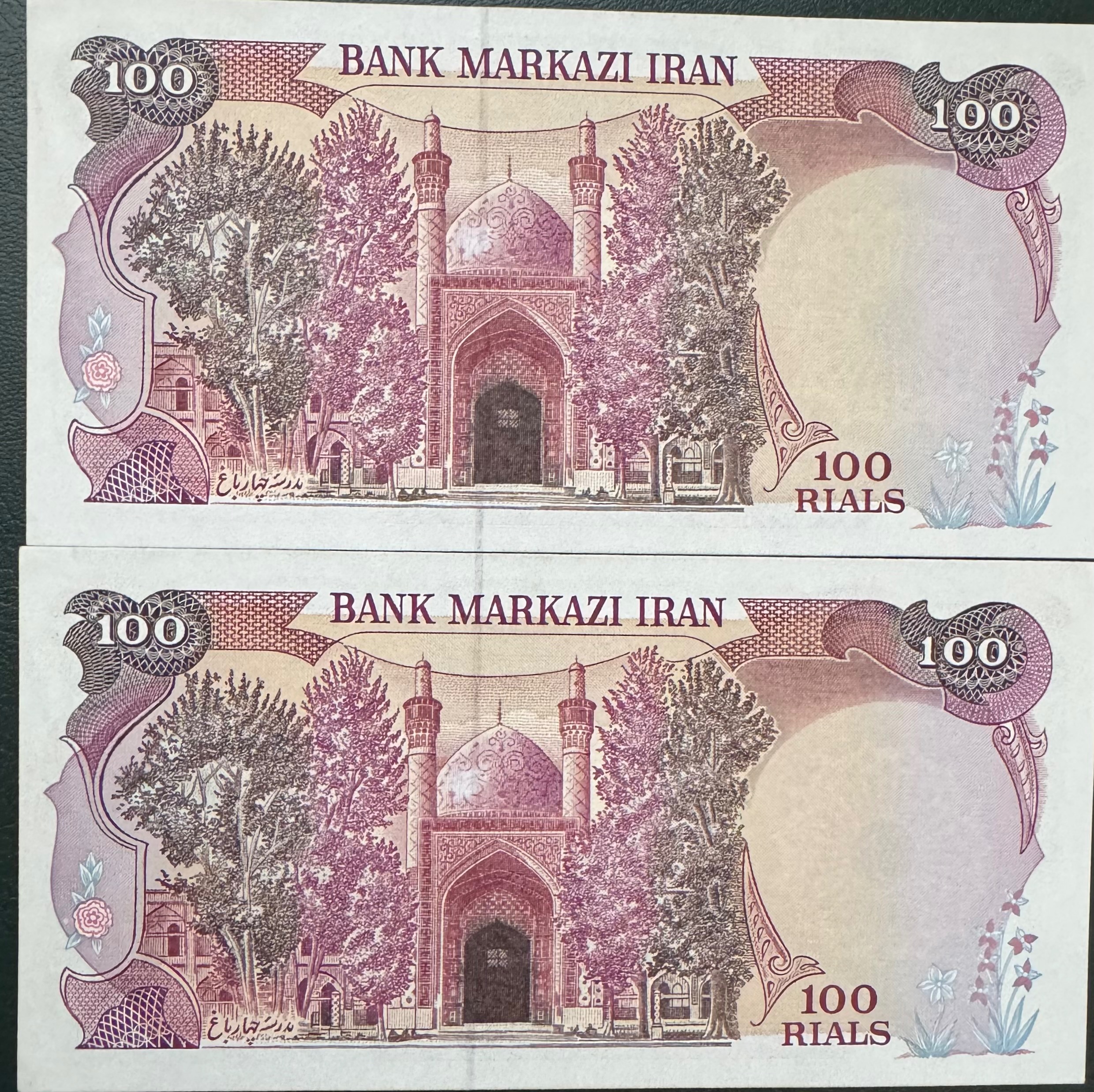 جفت 100 ریال بارگاهی   کیفیت 95% سوپر بانکی بدون شتسشو وپرس سری پنجم سال انتشار 1359 روی اسکناس : بارگاه امام رضا (ع)  و پشت اسکناس : بارگاه امام رضا(ع)  چاپ : چاپخانه  دلارو (انگلیس )