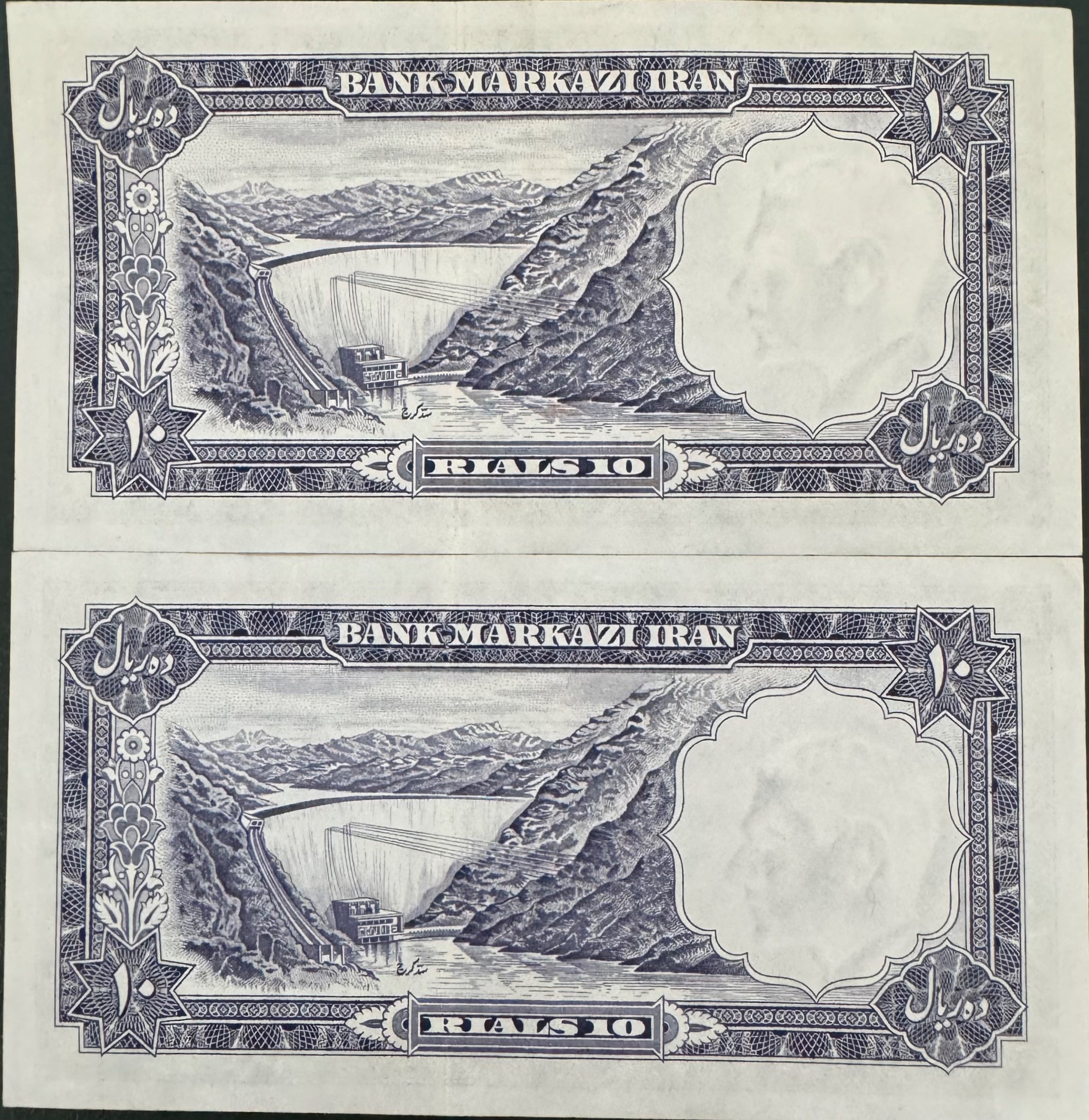 جفت 10 ریال 1340 کیفیت 99% سوپر بانکی بدون شتسشو وپرس سری : اول سال انتشار: 1340  روی اسکناس : تصویر محمد رضا پهلوی و پشت اسکناس : سد کرج