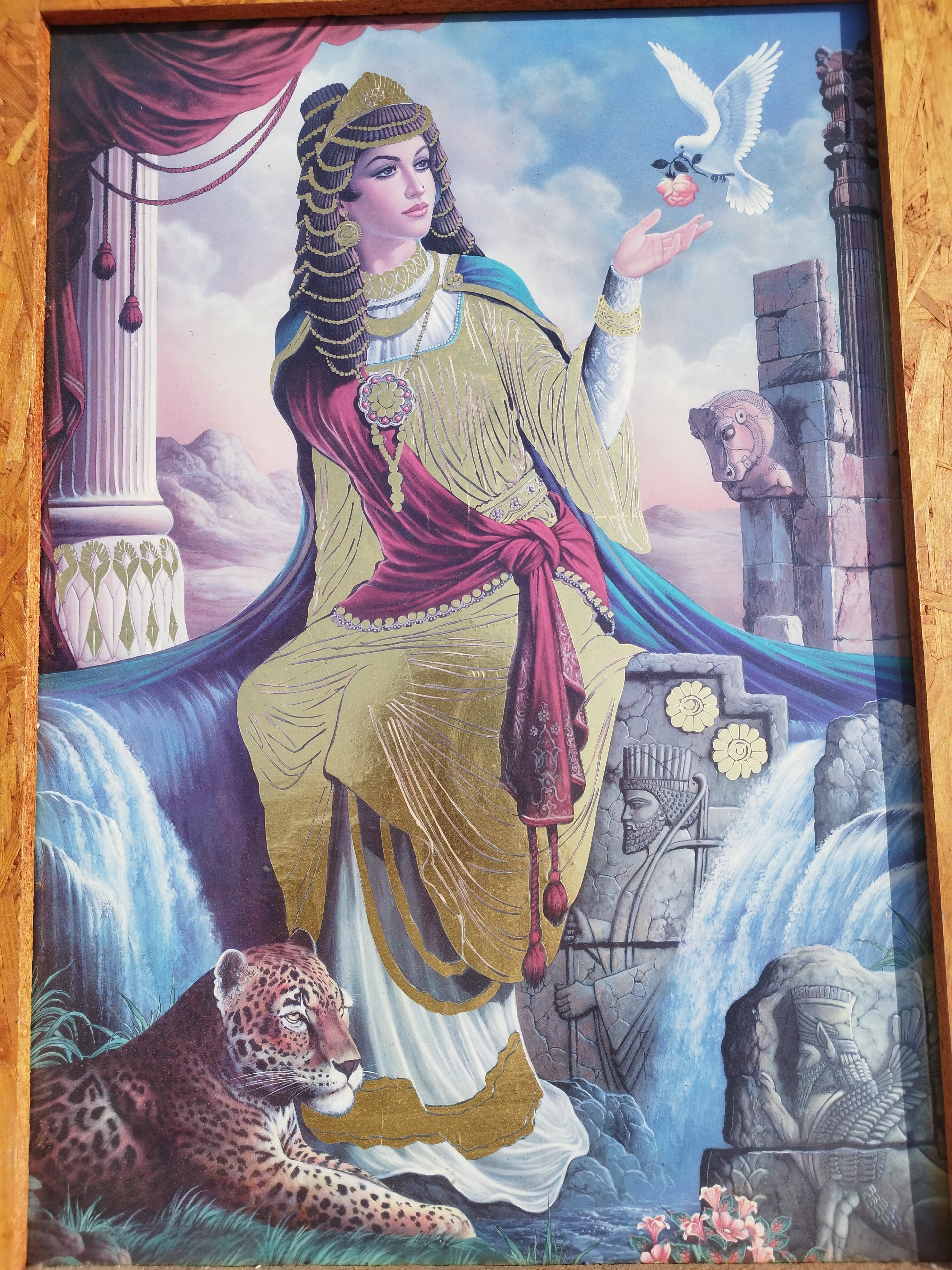 این تابلو حدودا سی وپنج در هفتاد و پنج ،اطلاعی از سبکش یا ارزش واقعیش ندارم ، لباس نقاشی براق مثل طلاکاری هست ،