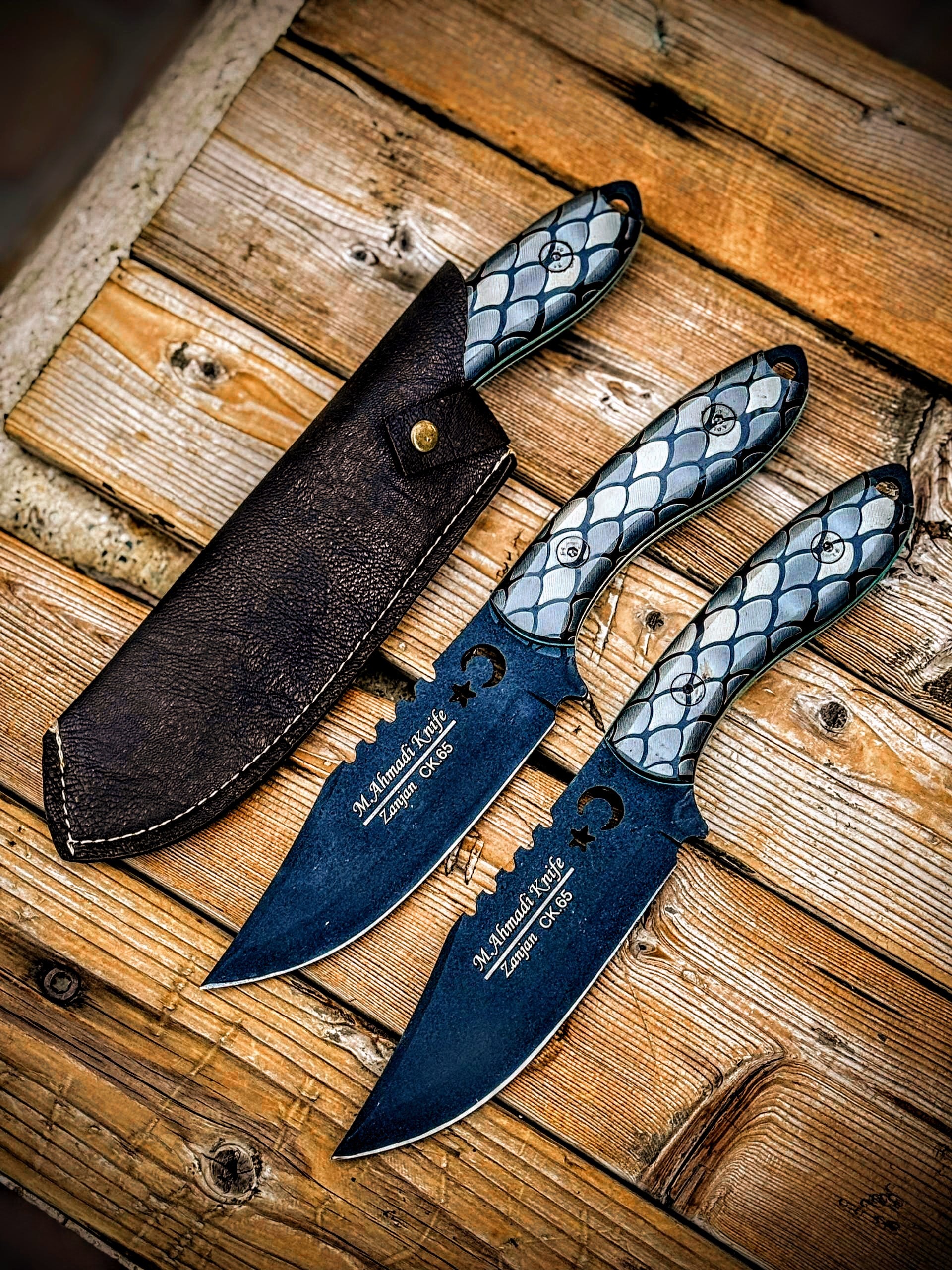 چاقو شکاری طرح دسته پوست ماری تیغه استیل فولاد خشکه طرح دودی تیزوبرا تضمینی سایز 27سانت همراه غلاف چرمی کار زنجان و کلیه سفارشات چاقوکلکسیونی وسفارشی وبازاری وقدیمی پذیرفته میشود