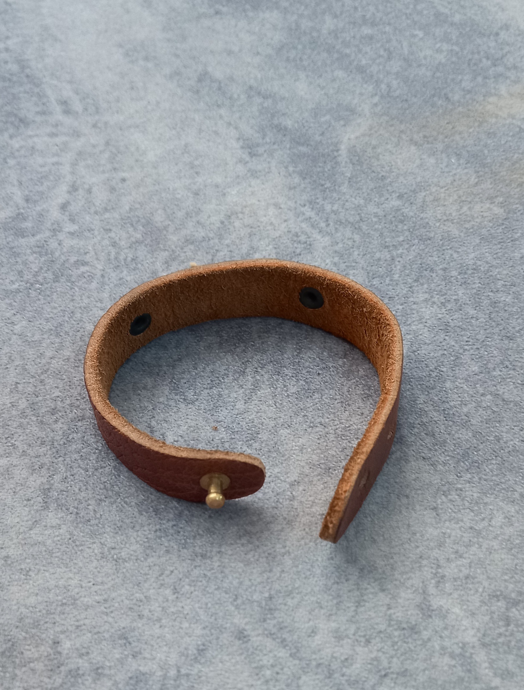 جنس دستبند چرم طبیعی و جنس پلاک روی دستبند برنج هستش که تغییر رنگ نمیده