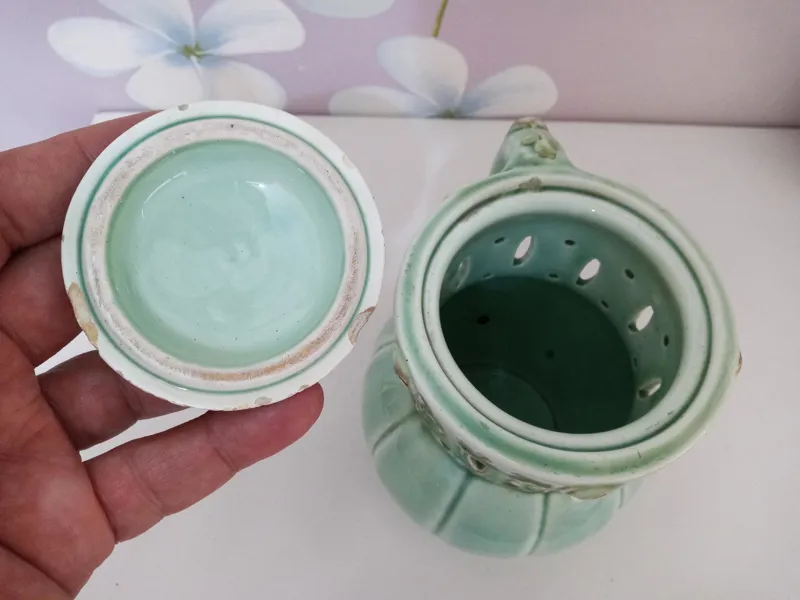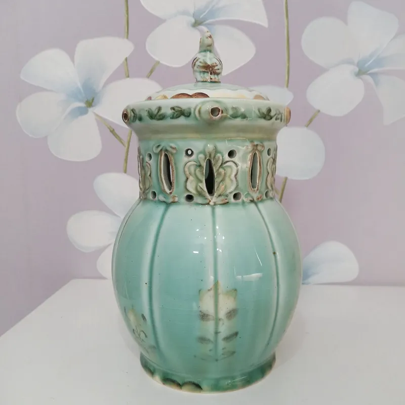 تنگ درب دار سرامیکی روسی قدیمی دوره تزار به ارتفاع 18 سانت و قطر دهنه9 سانت.