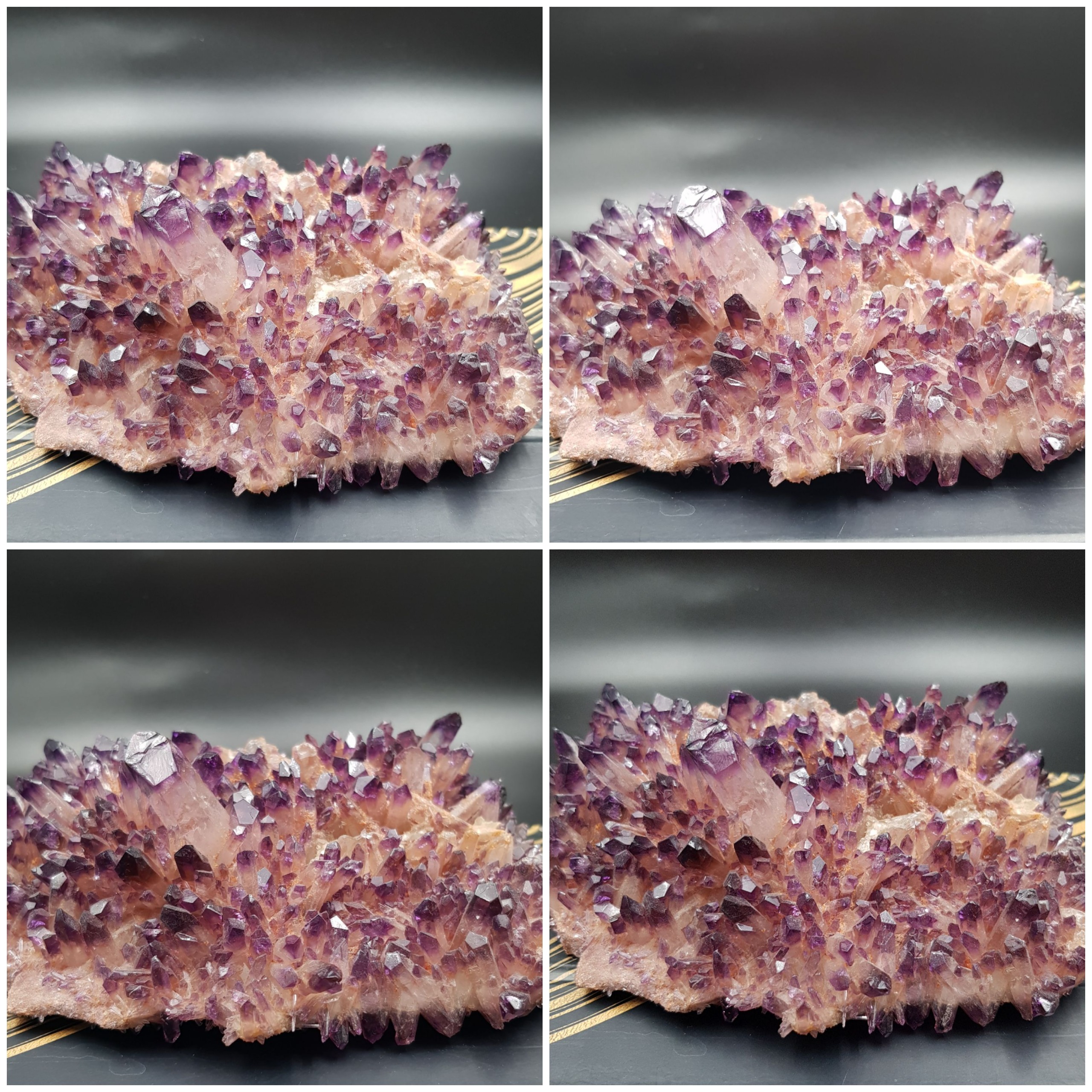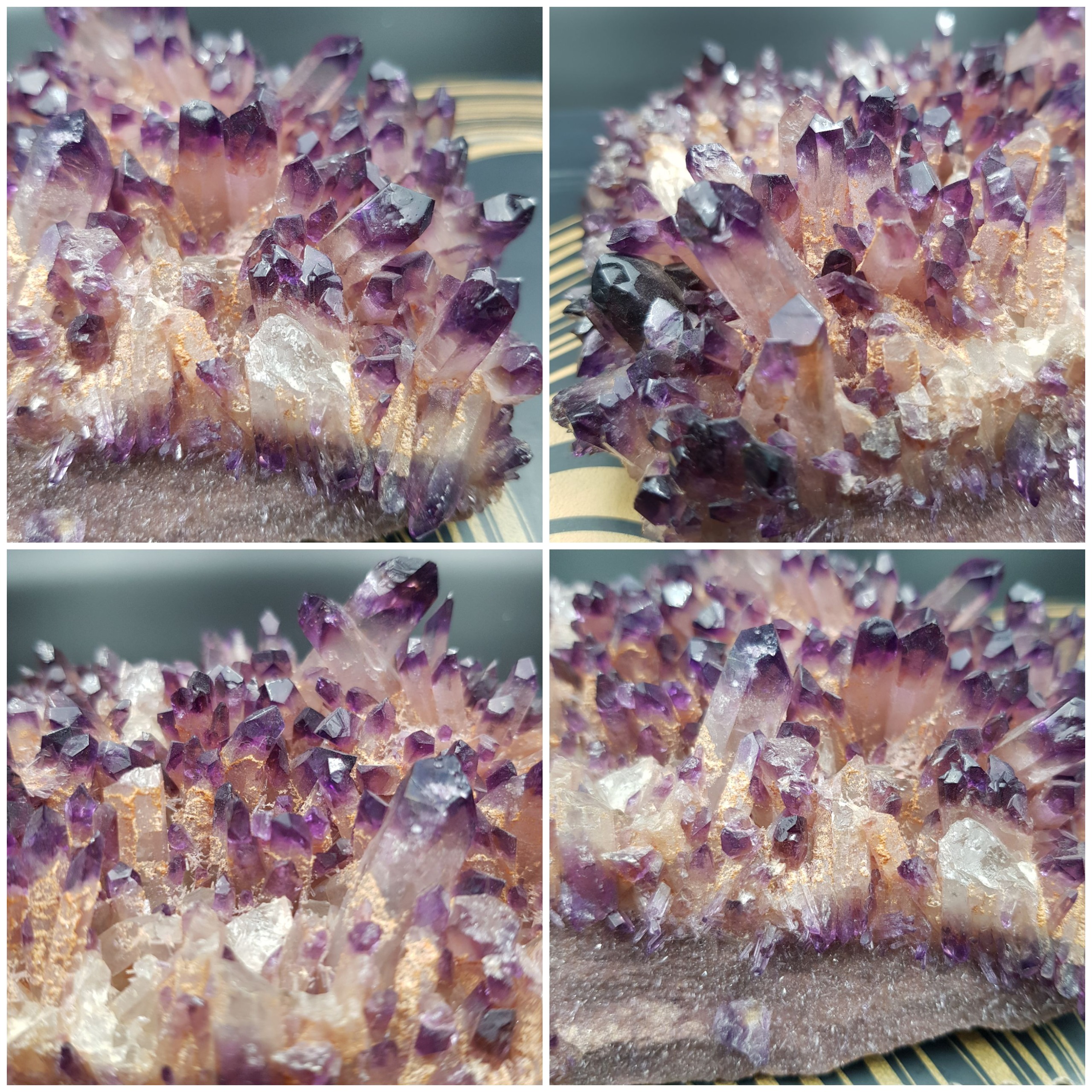 تجمع کریستال های آمیتسیت روی سطح با این شکل رشد عمودی و با این ترکیب رنگ که فقط نوک کریستال ها به رنگ بنفش درآمده در طبیعت بسیار کمیاب و نادر است.