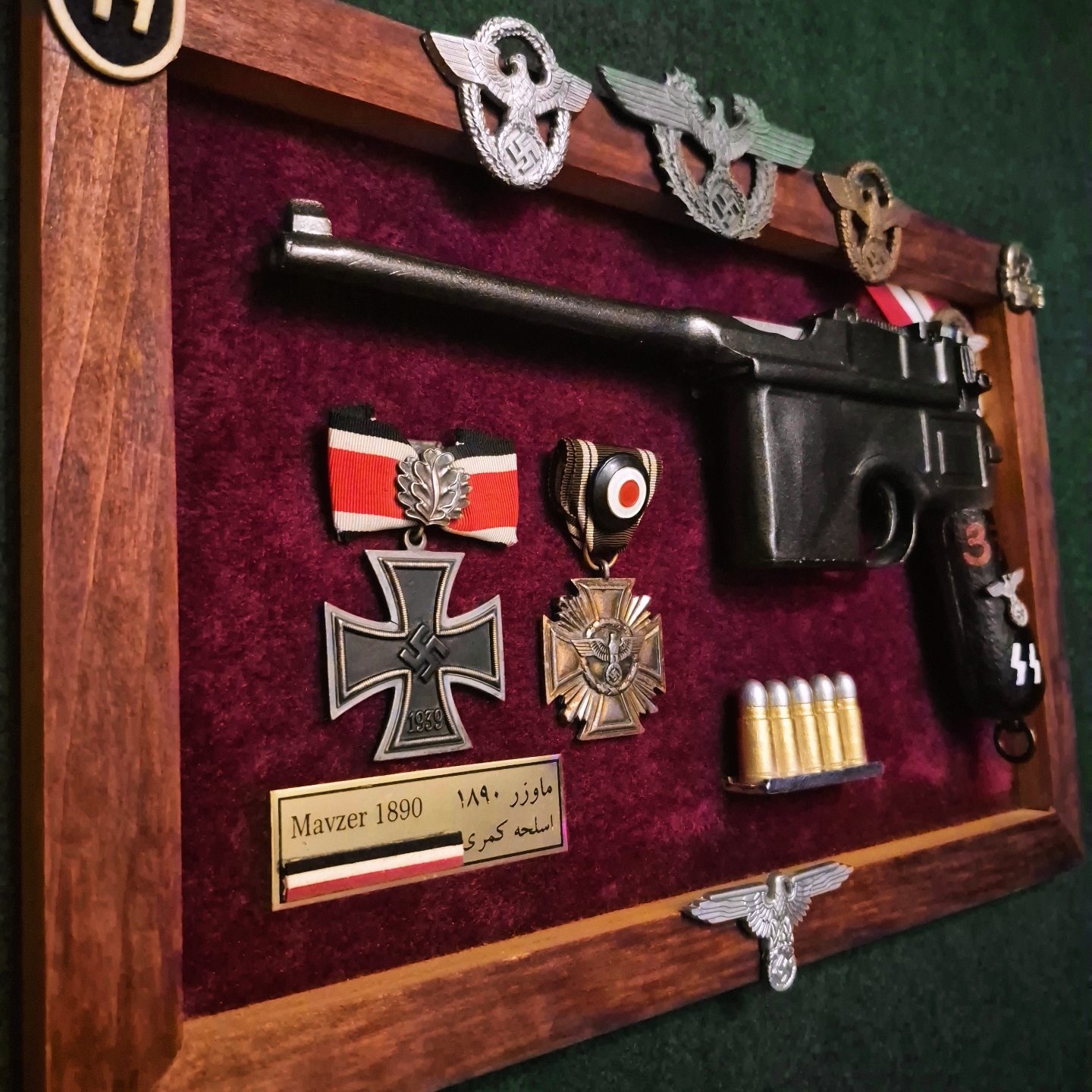 دارای پلاک آهنی طلایی با نام فارسی و انگلیسی تپانچه و نشان پرچم آلمان