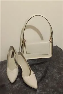 ست کیف و کفش کفش مجلسی شیری سفید کرم عروس چرم اصل قد پاشنه 9 سانت سایز 38 زنانه دخترانه ابعاد کیف 25در17