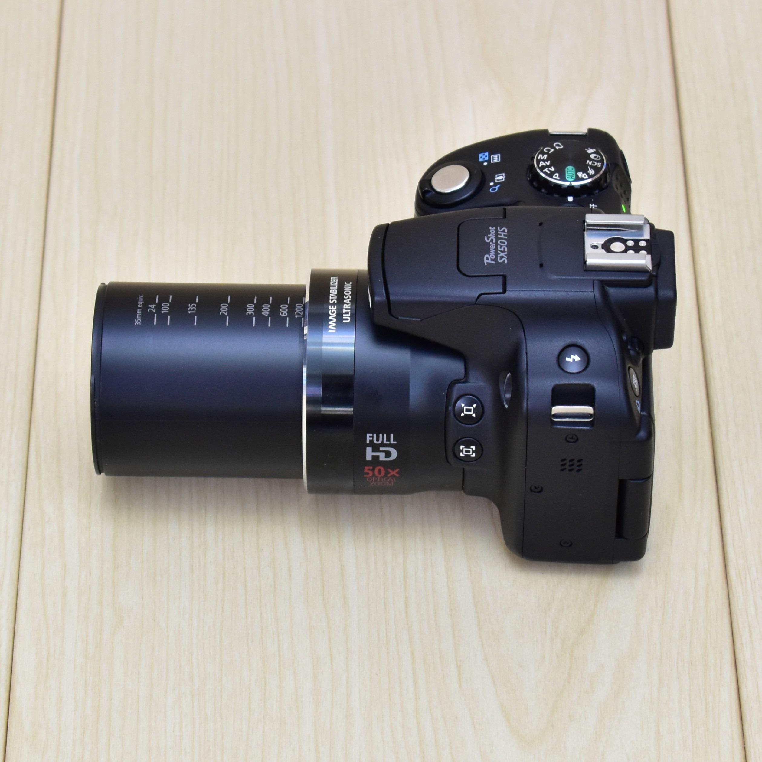 از دید مقابل بدون در نظر گرفتن نام دوربین ، بسیار مشابه دوربین های DSLR میباشد. دستگیره ی عمیق و بزرگ دوربین، کفشک و فلش جانبی، لامپ کمک کننده AF در سمت راست لنز تمامشان در ایجاد این احساس مفید بوده اند. دوربین دارای بدنه ی زبر و خشنی می باشد که برای جلوگیری از لغزش به هنگام دستگیری به این شکل طراحی شده است. به راحتی می توان انگشتان را بدون تماس با استوانه ی لنز بروی دستگیره قرار داد. در کنار استوانه ی دهانه ی لنز 2 دکمه ی جدید برای کمک به زوم راحتر لنز طراحی شده است. یکی از آنها برای زوم بیرونی به صحنه برای جایگذاری دوباره سوژه ای که بروی آن زوم کرده بودید طراحی شده است که با آزاد سازی همان دکمه زوم به همان فاصله ی کانونی که در امتداد زوم کرده بودید باز خواهد گشت. دکمه پایین آن نیز برای قفل و پیگیری بروی سوژه طراحی شده است که تا هنگام گرفتن عکس سوژه را در مرکز کادرتان قرار دهد. چیزیکه برای SX50 جدید می باشد کفشک دوربین می باشد که پذیرای اسپیدلایت های EX کانن می باشد و قدرت و قابلیت های دوربین عکاسی Canon SX50 را در شرایط کم نور به طور چشمگیری بالاتر خواهد برد