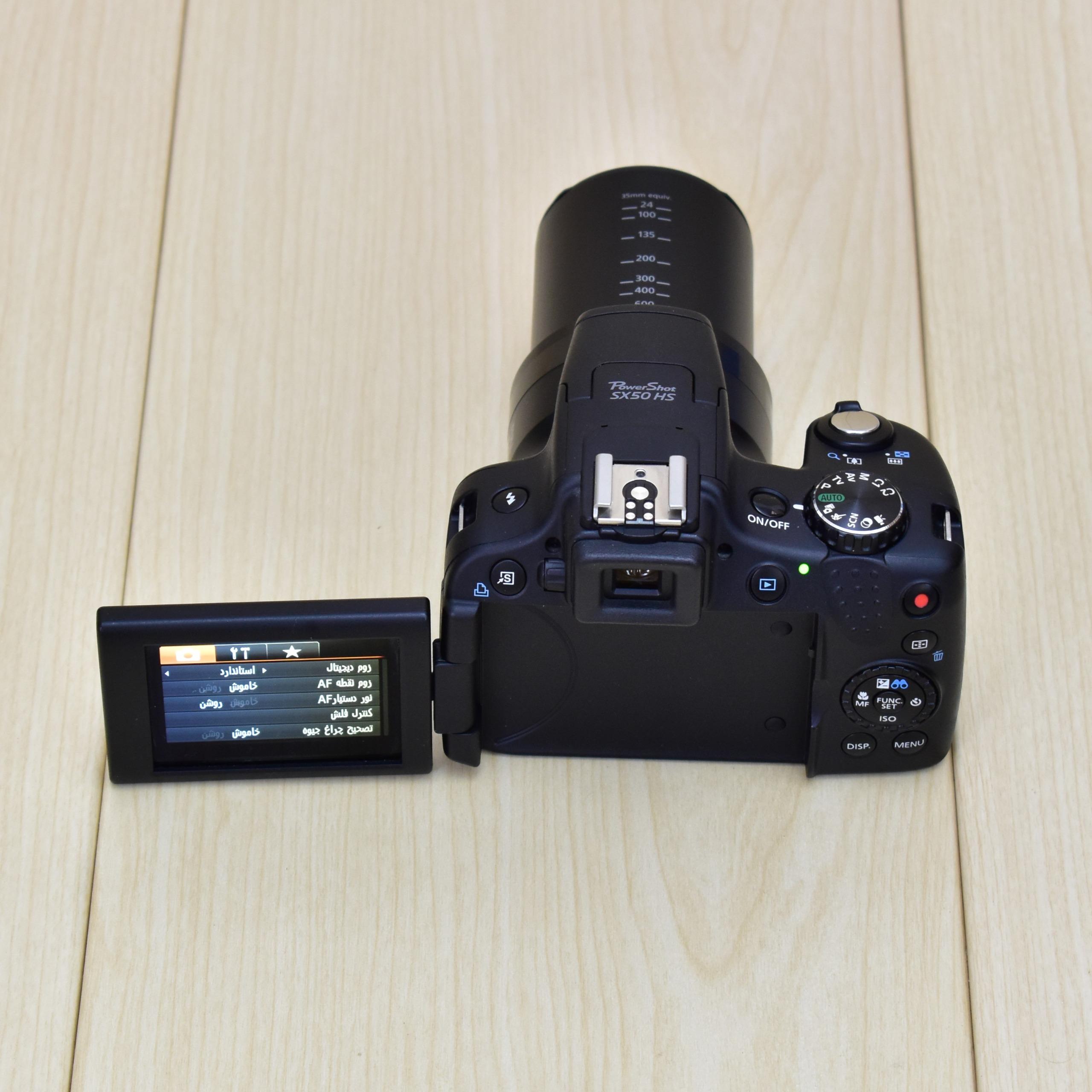 در پشت دوربین دیجیتال پاور زوم کاننSX50 یک نمایشگر زاویه دار و چشمی الکترونیکی ثابت وجود دارد. این چشمی با بستن نمایشگر به داخل بدنه فعال خواهد شد و بر روی آن هیچ گونه سنسور چشمی وجود ندارد همچنین هیچ دکمه ی مشخصی برای جابجایی نمایشگر و EVF نیز روی دوربین به چشم نمیخورد.از دیگر قابلیت های SX50 نیز میتوان به عکاسی ماکرو 0 سانتی متری و قابلیت Anti Shake که برای حفظ شارپنس عکسهایتان در سرعتهای پایین طراحی شده است اشاره کرد.