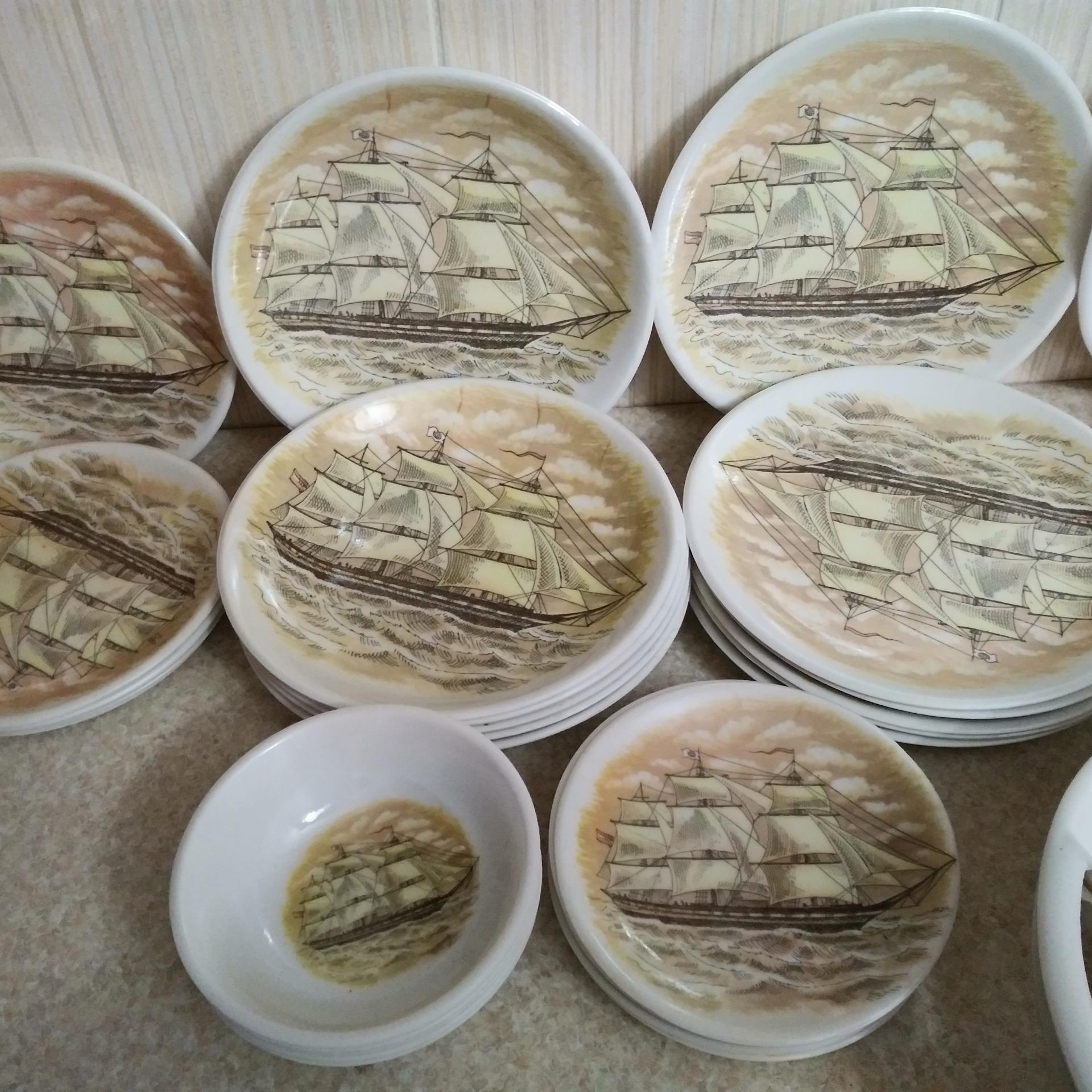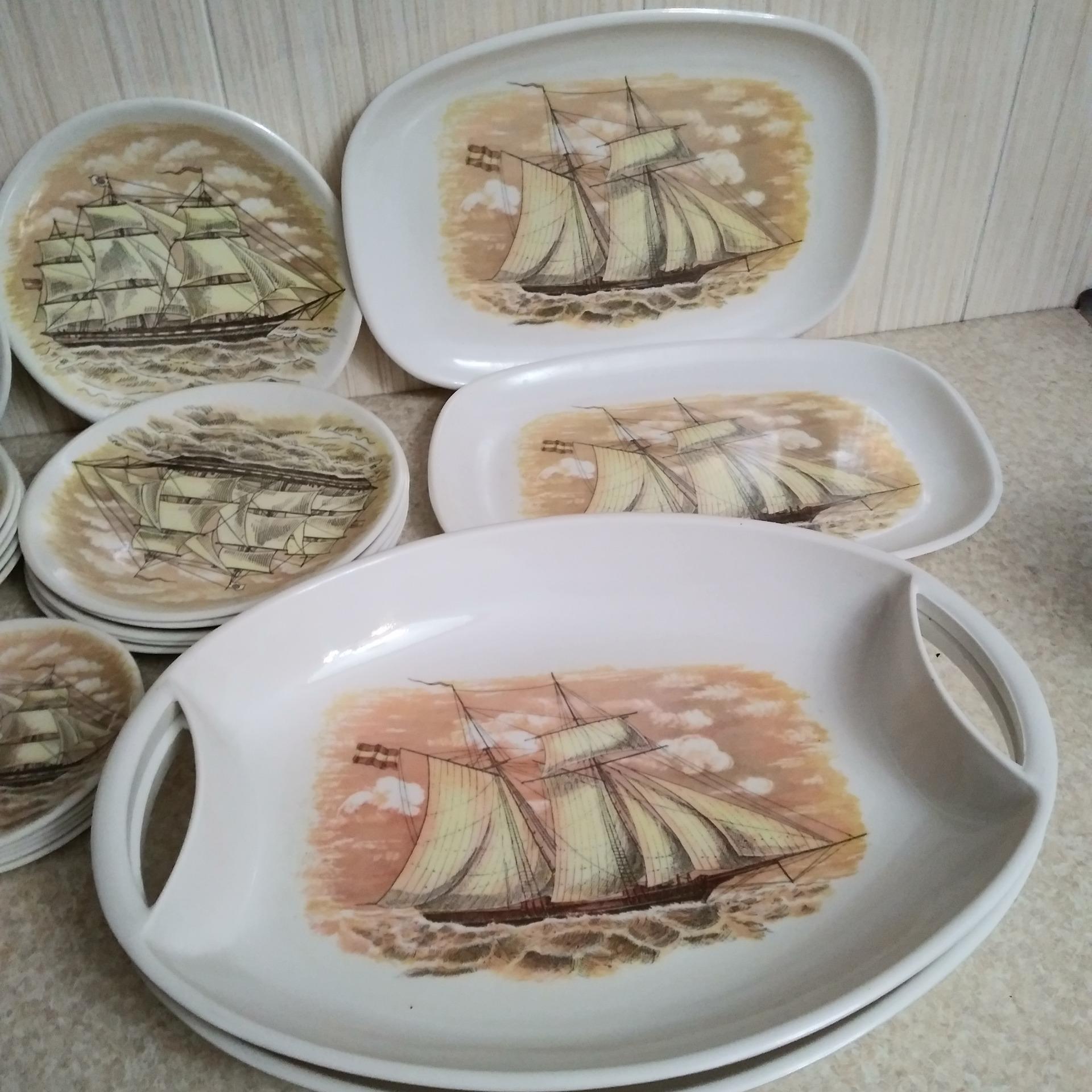 سلام. سرویس کامل ملامین طرح کشتی 6 عدد خورشت خوری 6 عدد پلو خوری 6 عدد پیش دستی 6 عدد خیارخوری و 5 عدد پیاله. یک عدد اون زمون نمیدونم گم شده یا شکسته خلاصه 5 عدد هست. دو عدد دیس معمولی برنج و دو عدد دیس بزرگ دسته دار برنج. عزیزان سرویس بکر و اب نخورده هستن اما با توجه به قدمت شاید ایرادهای جزئی داشته باشن.. از دهه 50 به خوبی نگهداری شدن دو عدد دیس برنج بزرگ دسته دار مال یه سرویس دیگه هست تو عکس مشاهده کنید رنگش فرق داره کمی با بقیه ولی چون عکسشون یکی بود گذاشتم پیش بقیه تا سرویس کامل تر بشه. سرویس ضخیم نیستن. چون دو نوع ضخامت ملامین داریم ضخیم و معمولی. اینا معمولی هستن. مارک پشت بشقاب رو تو عکس گذاشتم مال کاشان هستن. یه سرویس شیک و بسیار نایاب و خاص و خاطره انگیز. قیمت کاملا مقطوع. دوروبره 700 هزار برا خود سایت و مالیات هست و در مورد هزینه پستی که برنامه خودش 50 هزار زده که بالای 300 هزار با توجه به هزینه پستی در ازای سنگینی ظروف و هزینه قوطی که یه قوطی بزرگ میشه خواهد شد. ممنون از درک و فهمتون.