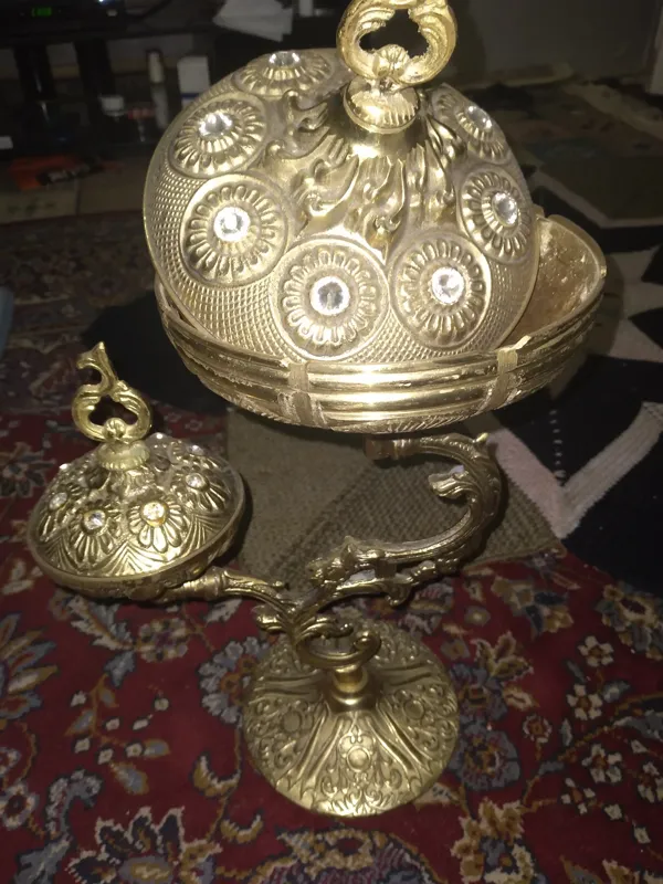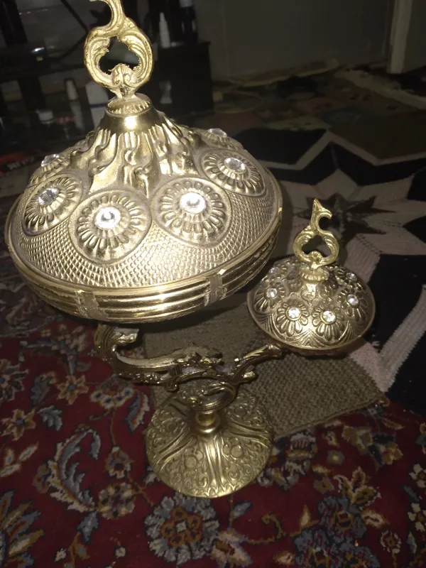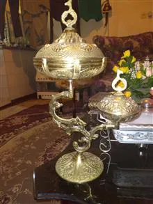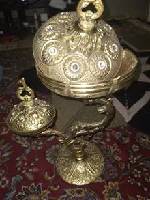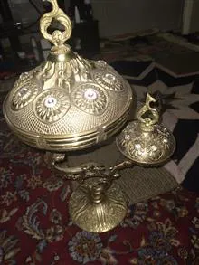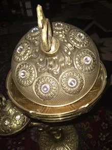 ظرف بزرگ و زیبای برنجی حدود 3 کیلو دارای دو کاسه واسه پذیرایی و درب ان با تزئین عقیق درشت وحکاکی بی نظیر