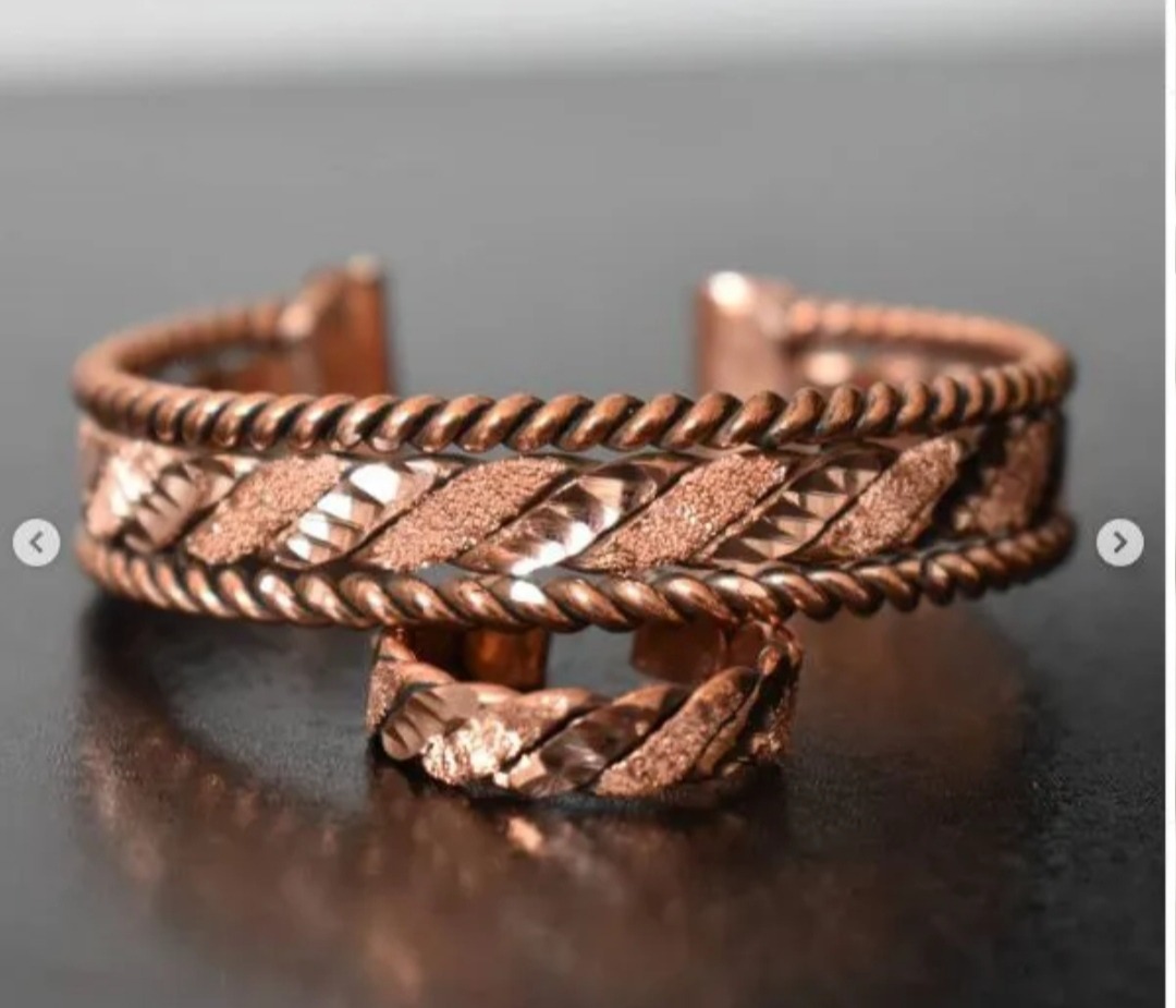 دستبند و انگشتر مسی سیاه قلم تراش دار،فری سایز