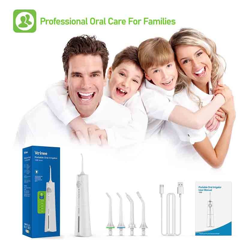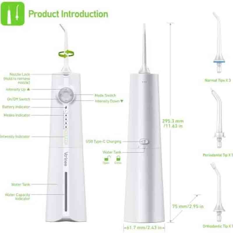 موارد یک دستگاه همراهشامل یک دستگاه دهانی بی سیم قابل شارژ Voinee، 5 نازل قابل تعویض با چرخش 360 درجه (3 نازل جت، 1 نازل ارتودنسی، 1 نازل پریودنتال) با رنگهای مختلف برای استفاده از قابلیت پذیرش و استفاده همزمان برای اعضای خانواده. همچنین کابل شارژ USB Type-C