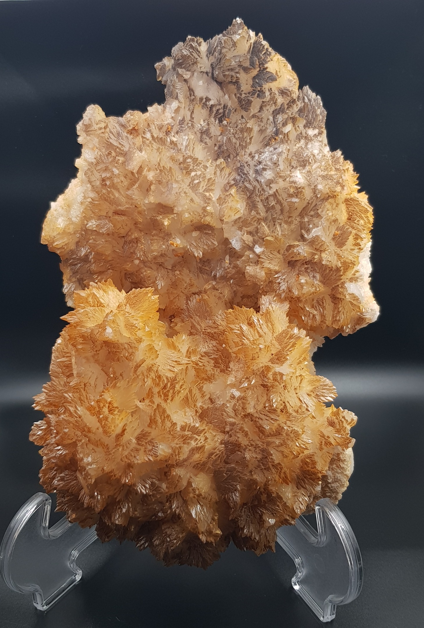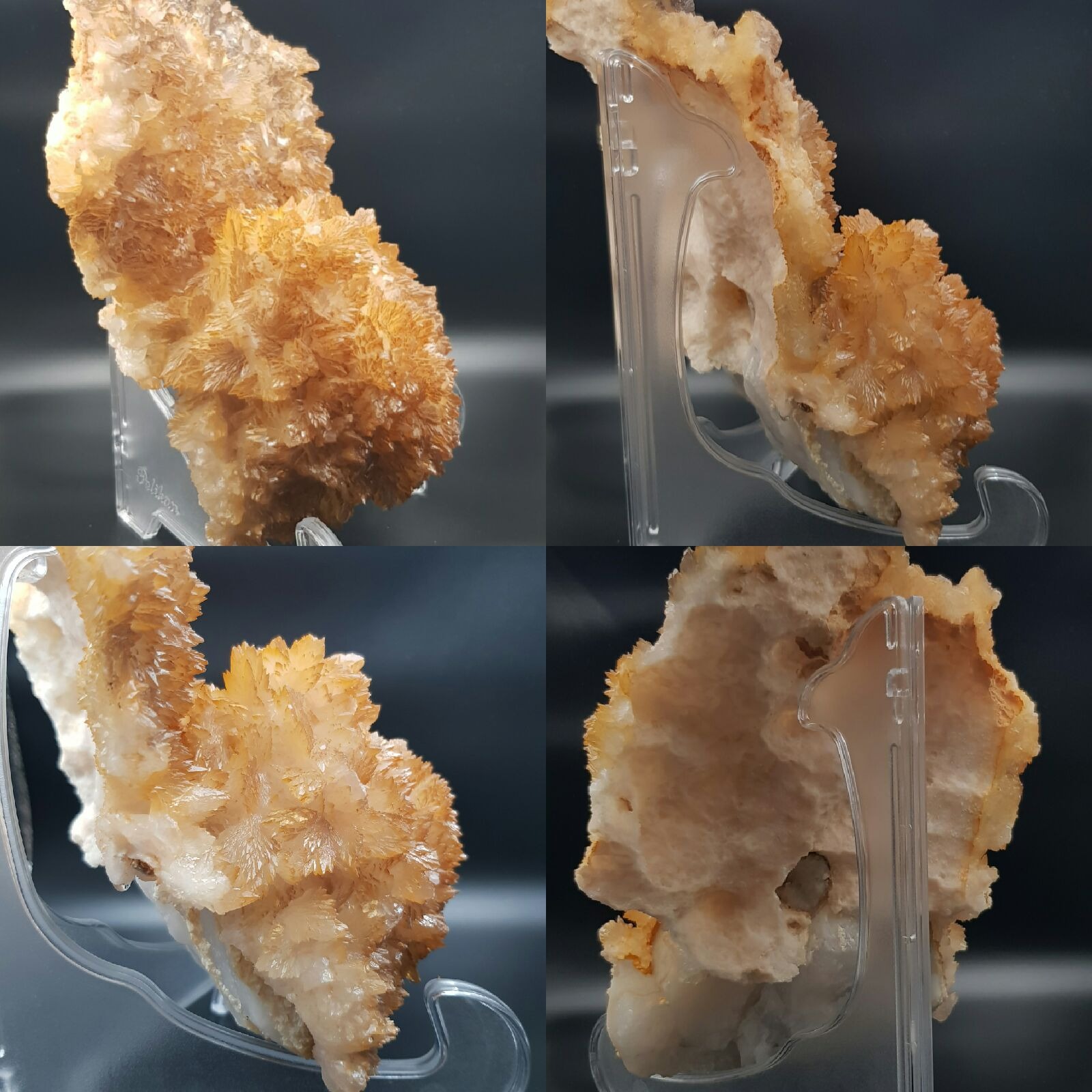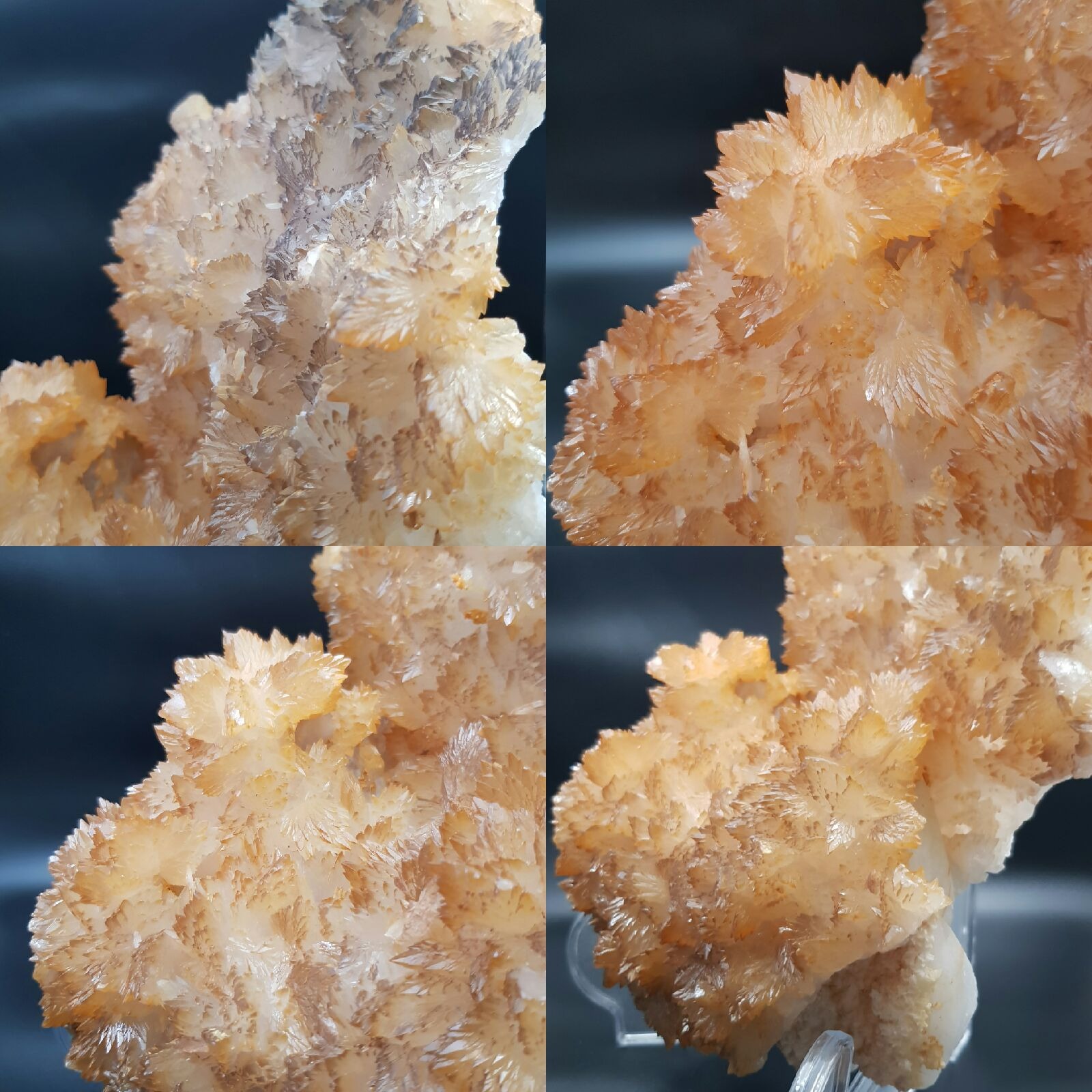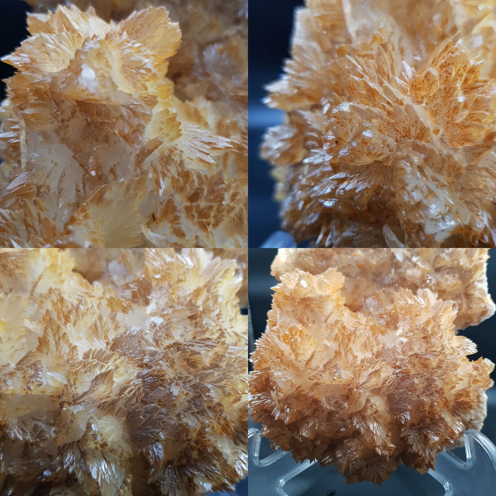دارای بی شمار بلور کلسیت برگی شکل سالم طلایی و شیری و دودی رنگ