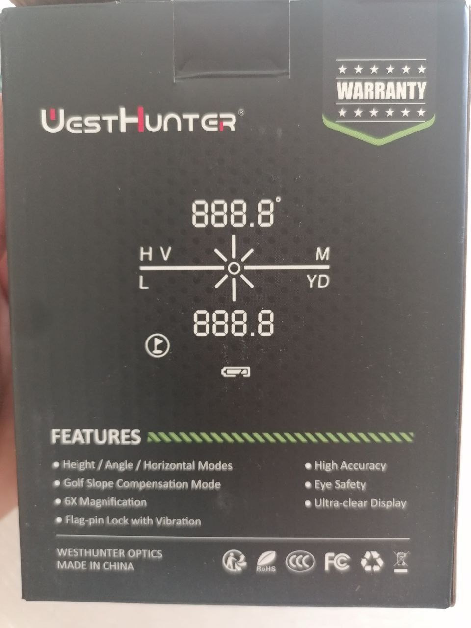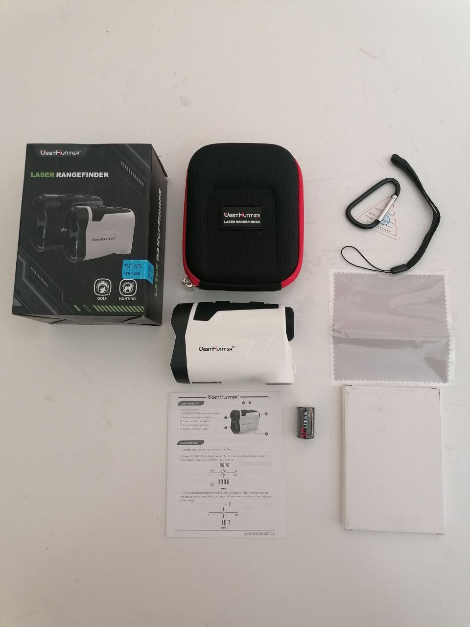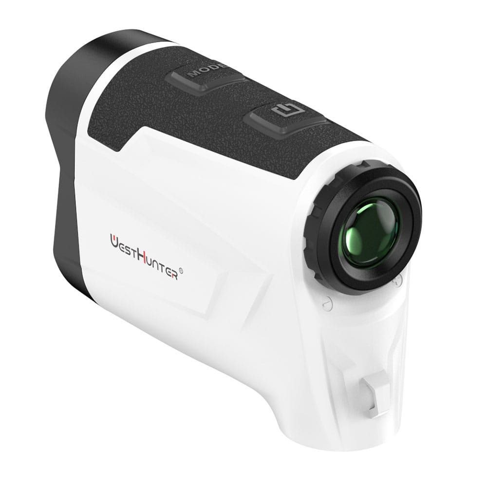 رنج فایندر 800 یارد وست هانتر زوم 6 رنگ سفید دارای شیب سنج ارتفاع متر و یارد زاویه گلف بهمراه باتری اصلی شرکت بند دفترچه دستمال کارابین کیف ضد ضربه شفافیت لنزها HD