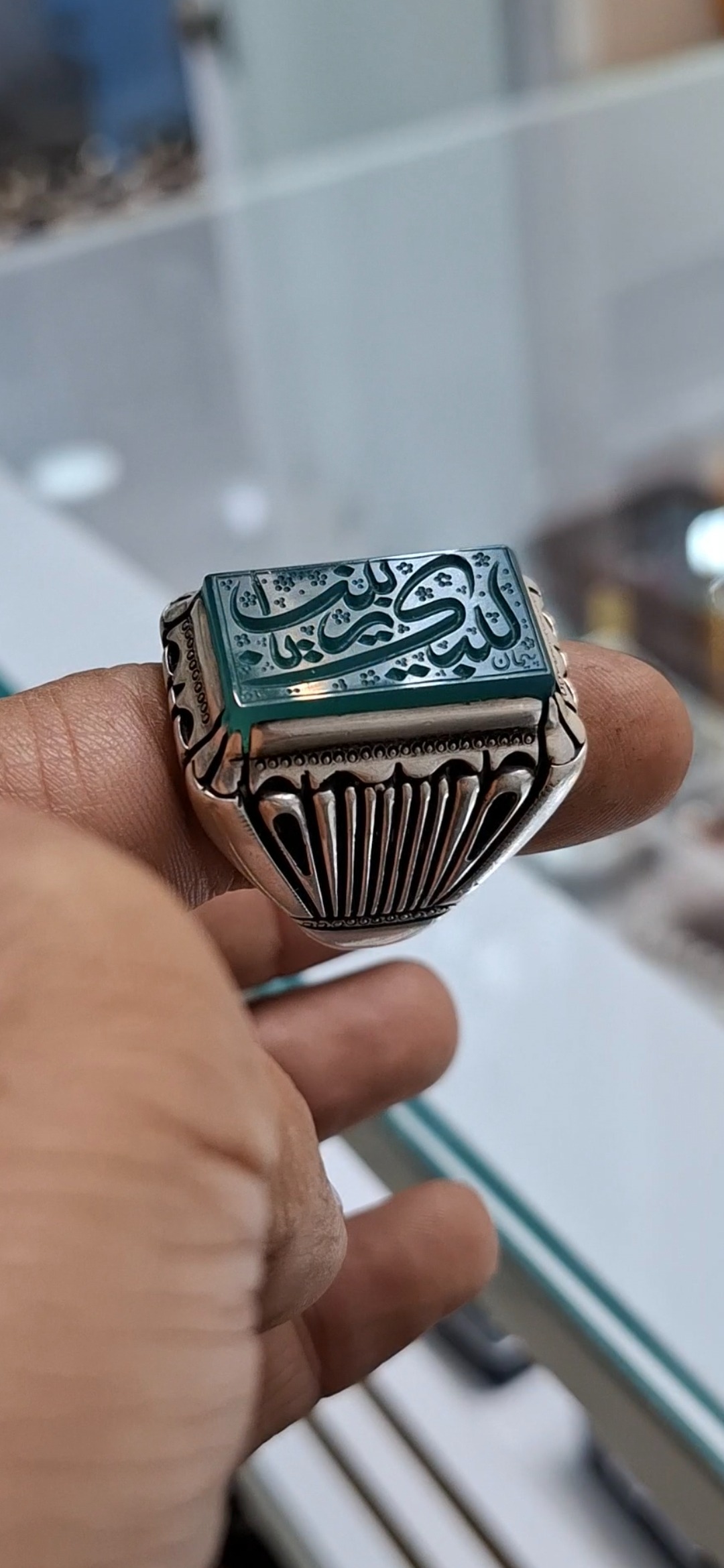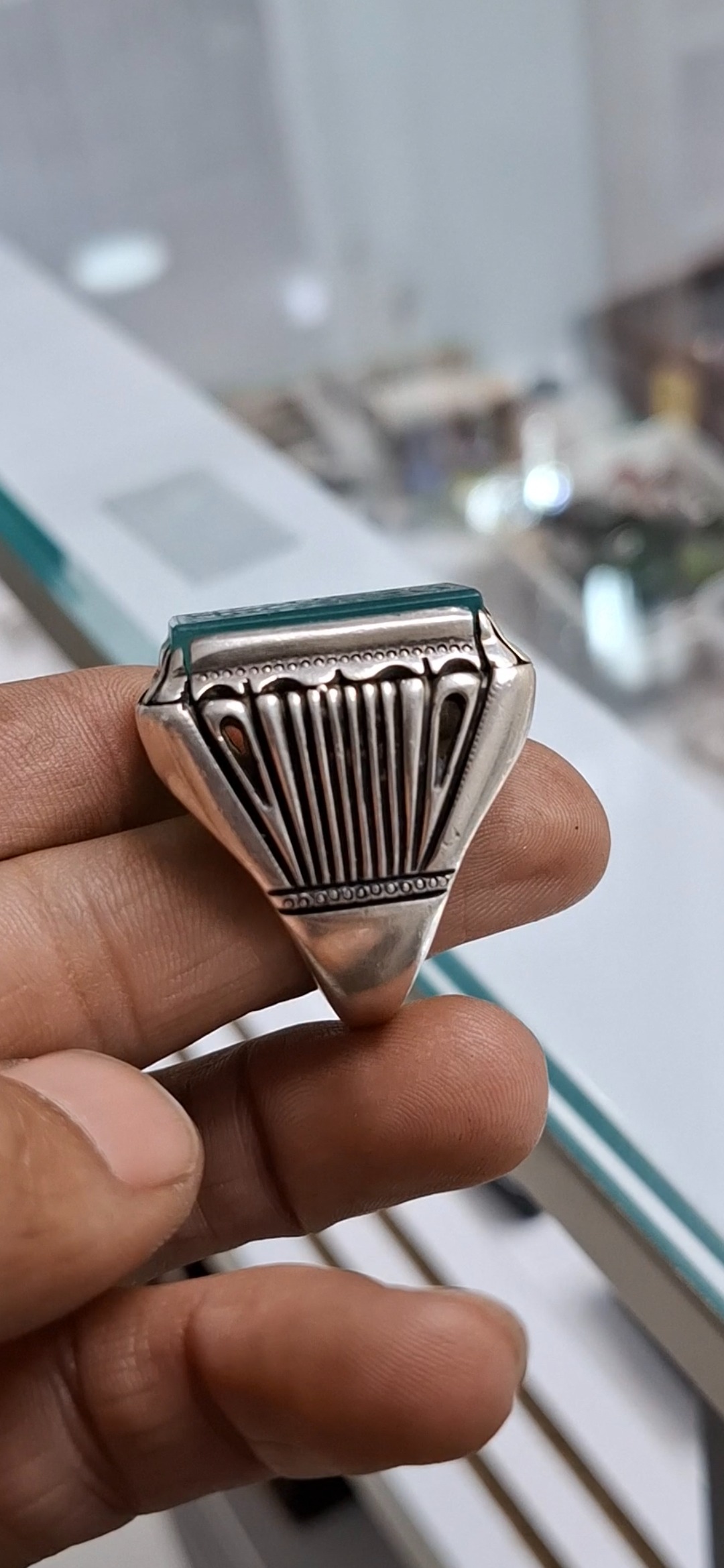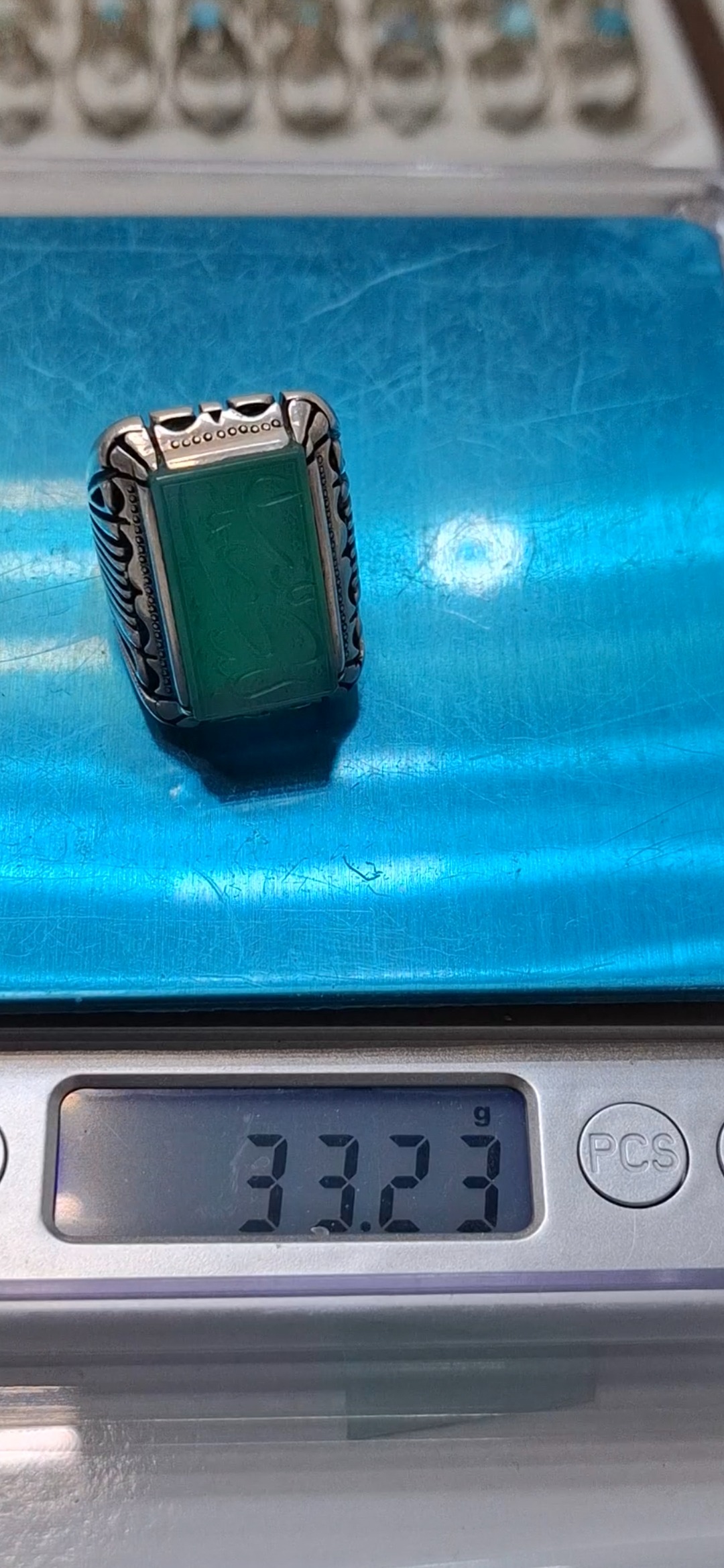 انگشتر نقره مردانه بانگین عقیق سبز خوشرنگ وآبدار باحکاکی زیبا و استادانه با امضا پیمان
