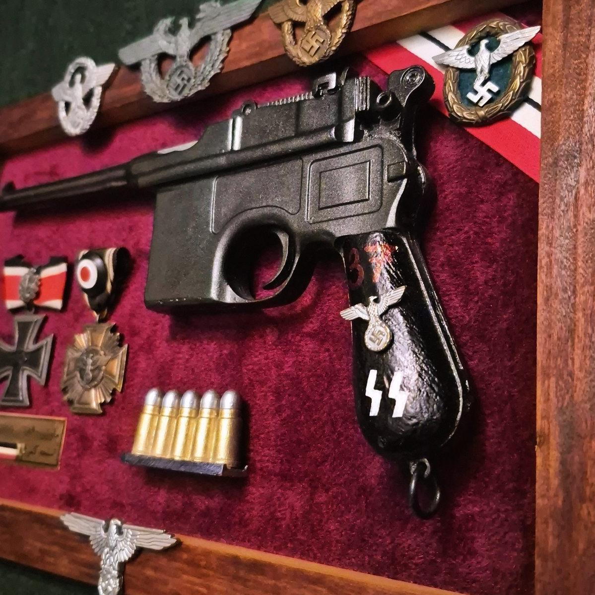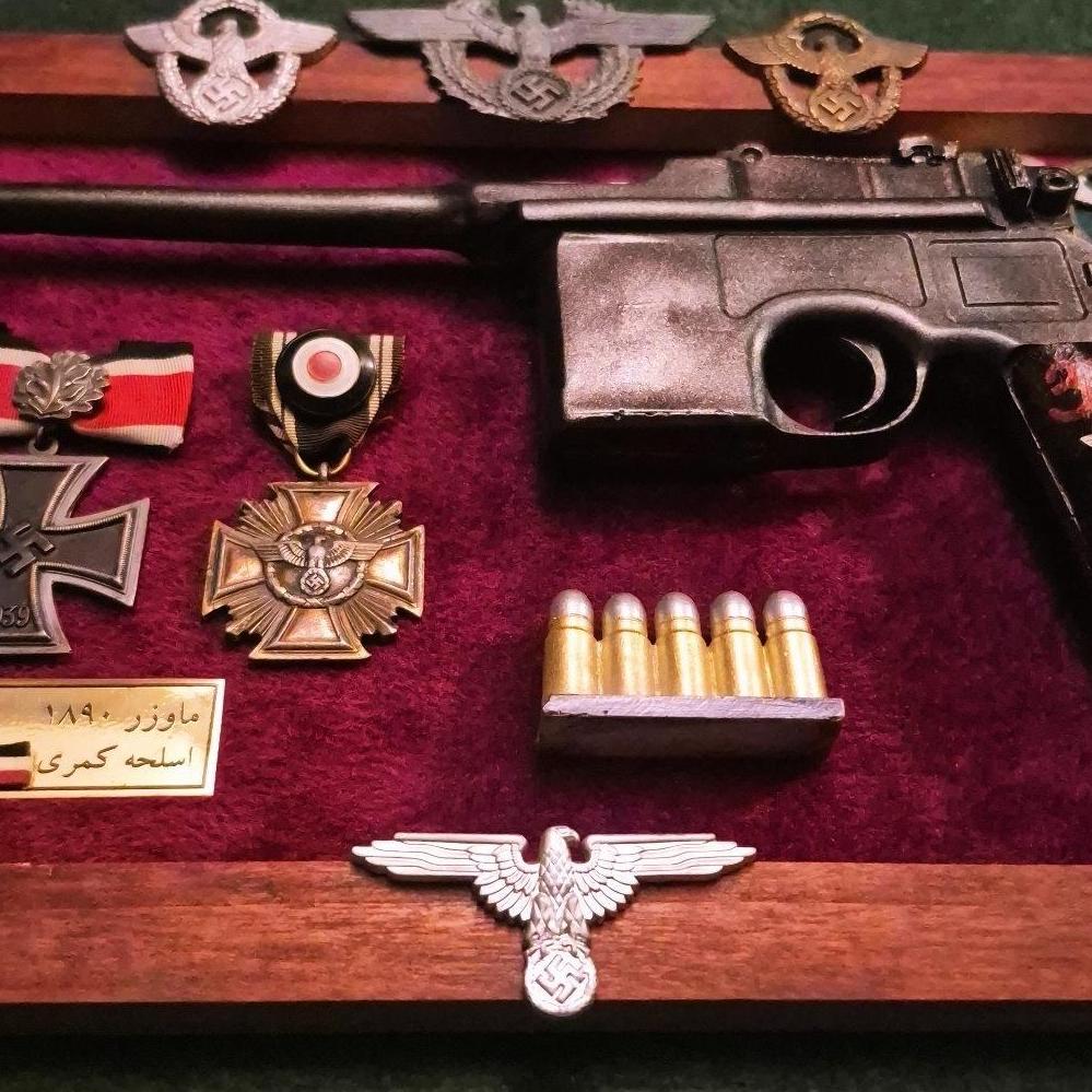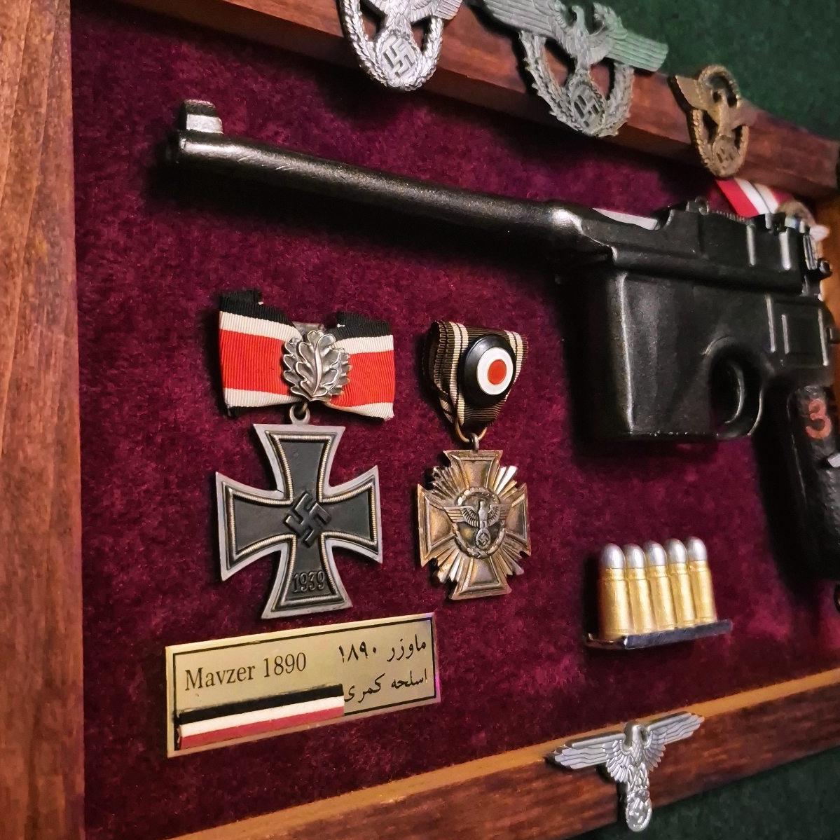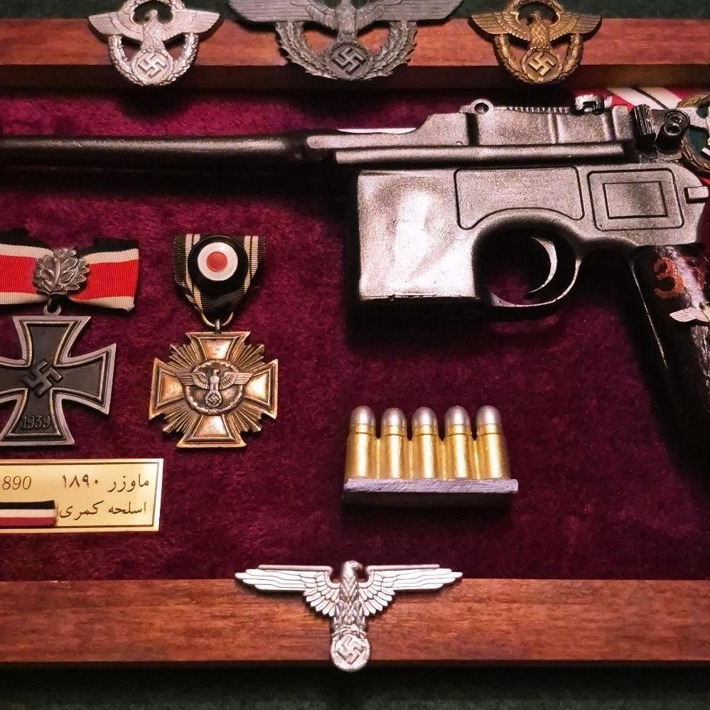 دارای پلاک آهنی طلایی با نام فارسی و انگلیسی تپانچه و نشان پرچم آلمان