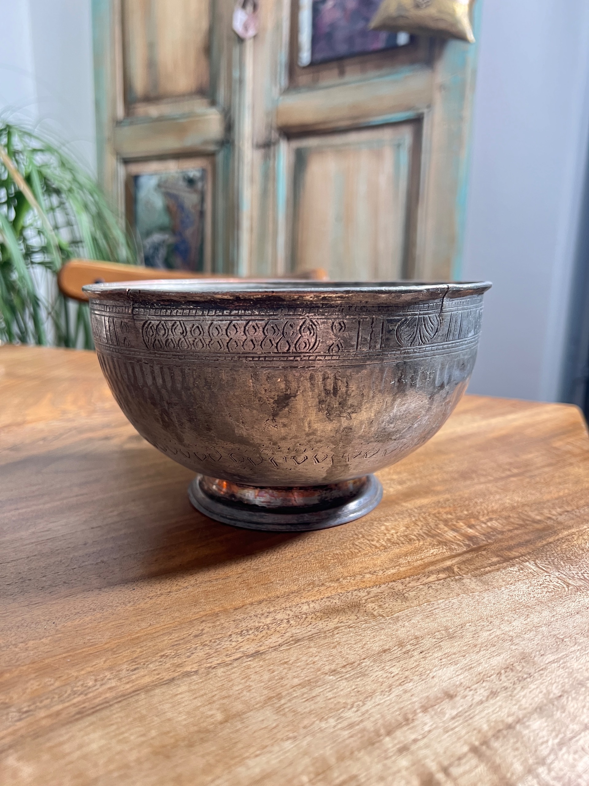 کاسه کعبدار قاجاری قلمزنی روی مس
