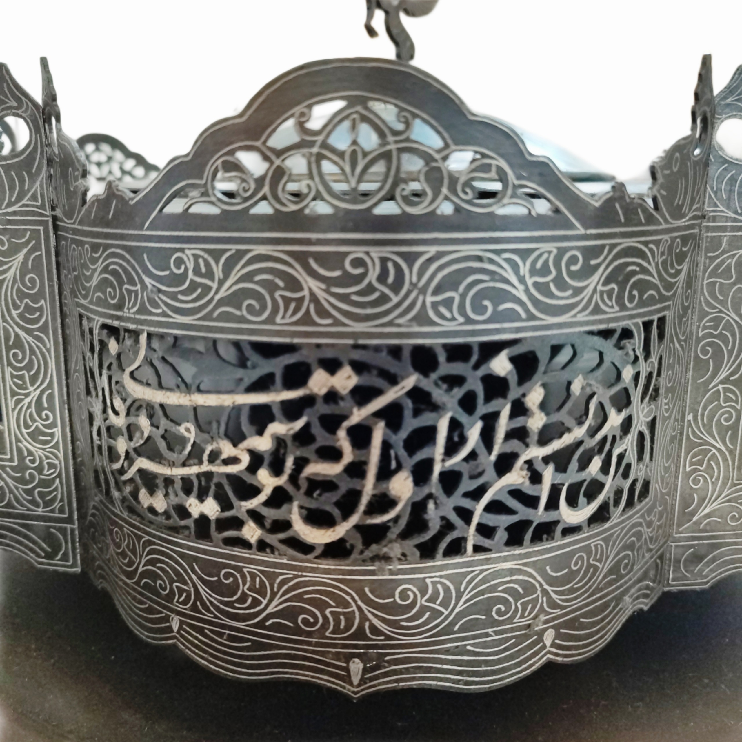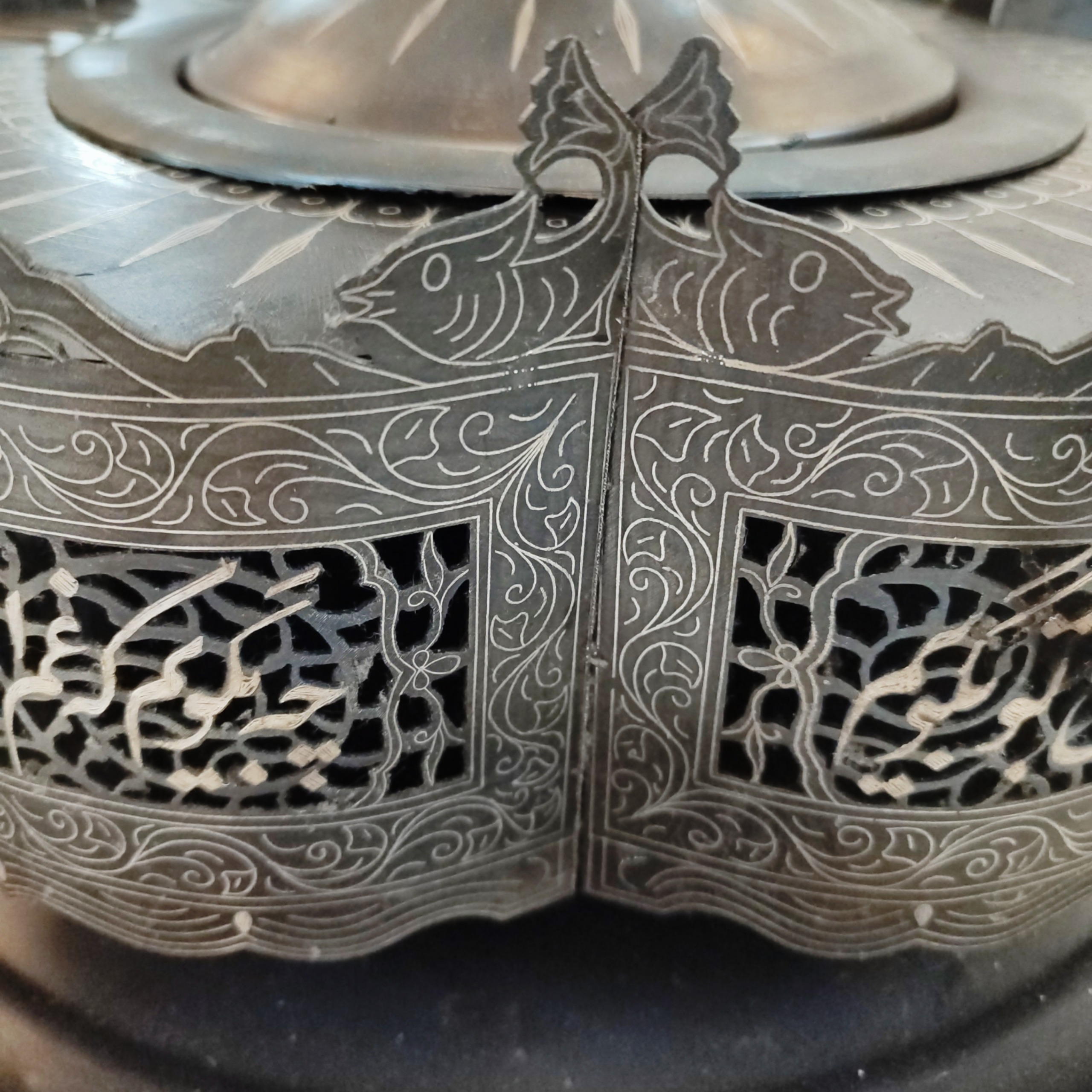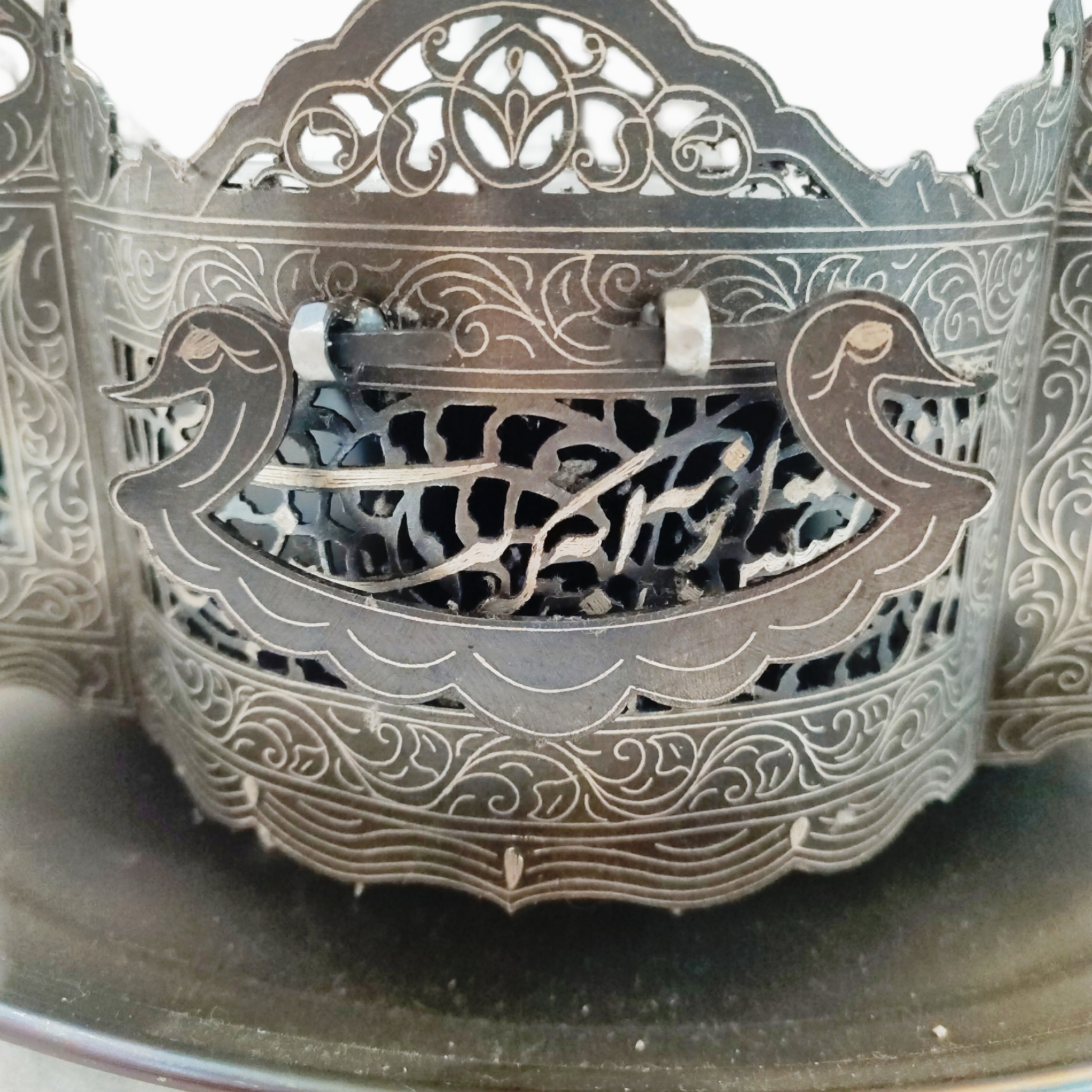 منقل ذغالی 6 پر و از جنس فولاد میباشد و روی آن نقره کوبی شده است. مشبک کاری های روی منقل زیبایی خاصی به آن میدهد. دور تا دور منقل شعر نویسی همراه با گل و بوته و نقره کوبی وجود دارد.