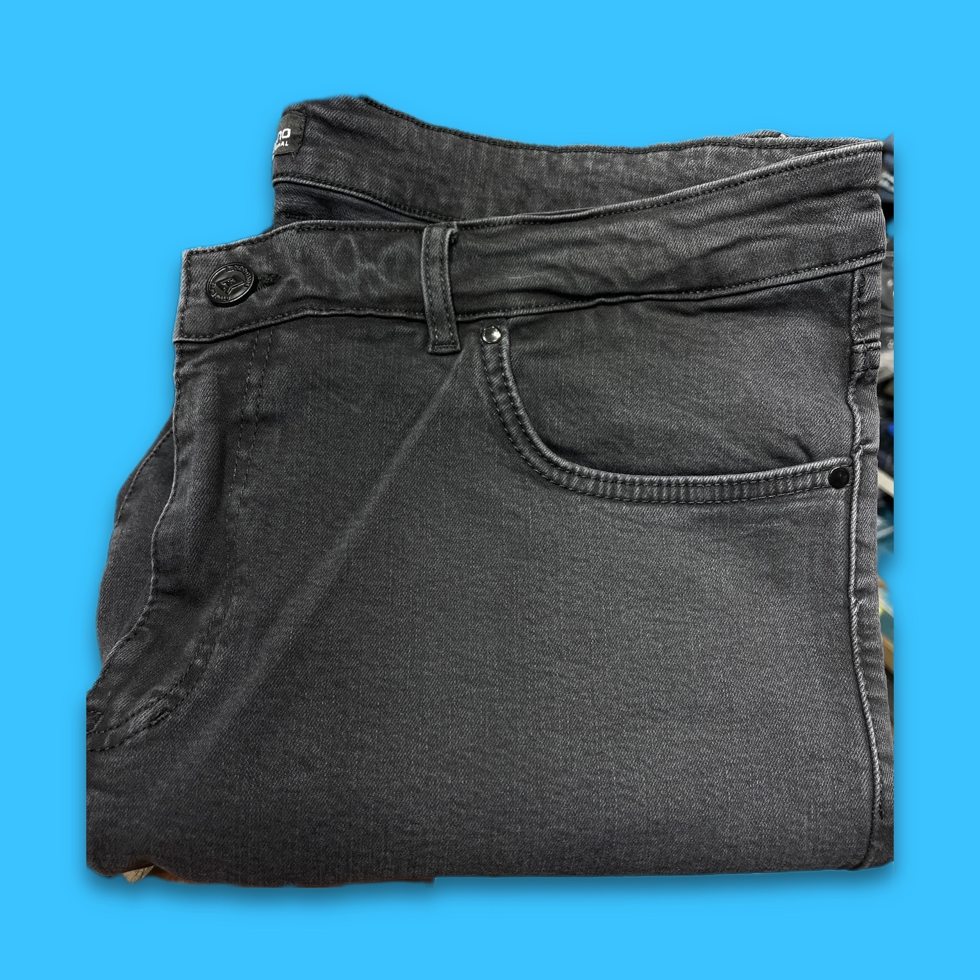شلوار لی برند لاکارینو رنگ خاکستری تیره بدون آبرفت بدون تغییر حالت و بدون رنگ دهی در صورت شستشو دارای کیفیت عالی در سایزبندی 42-44-46-48-50-52