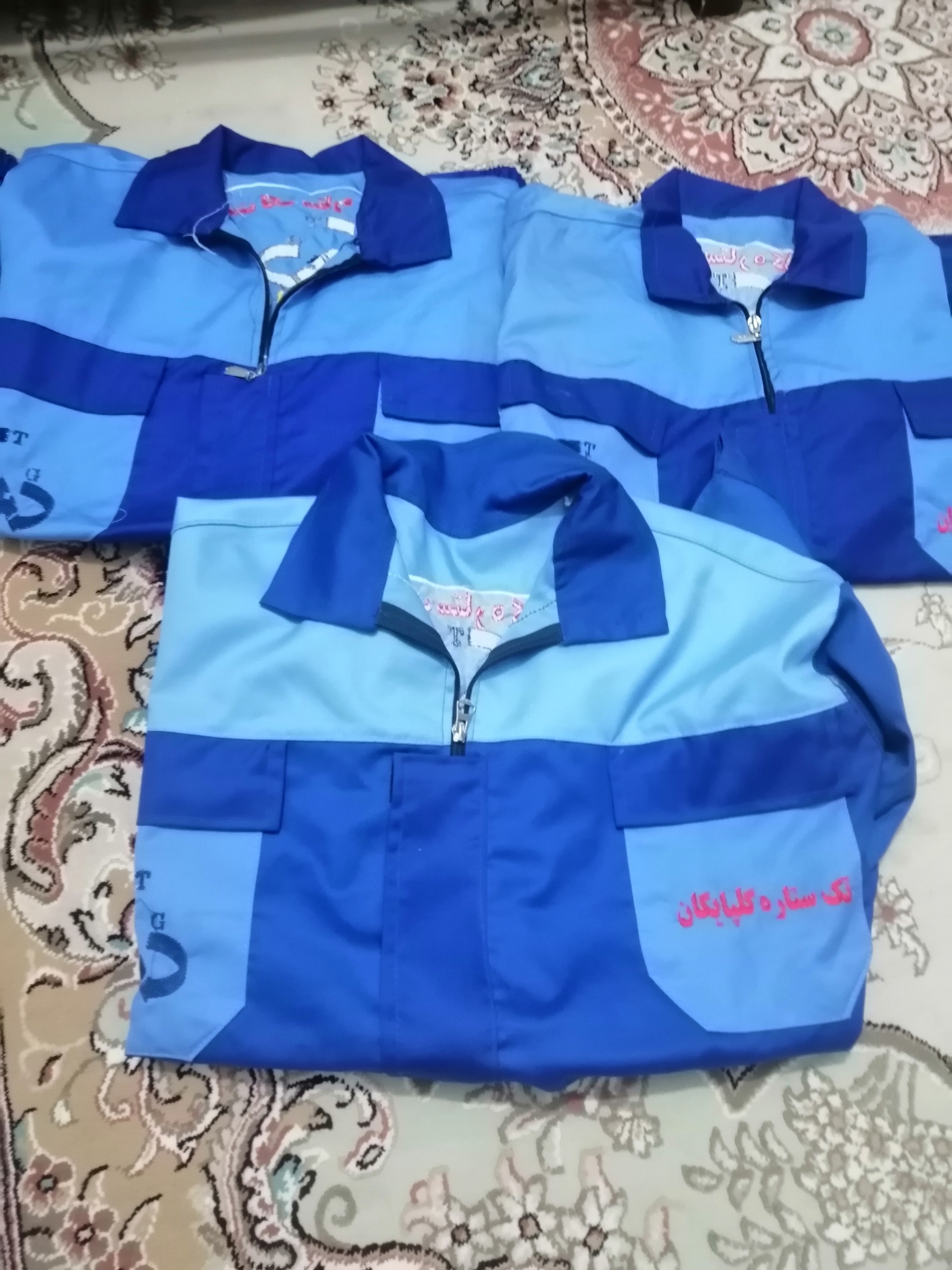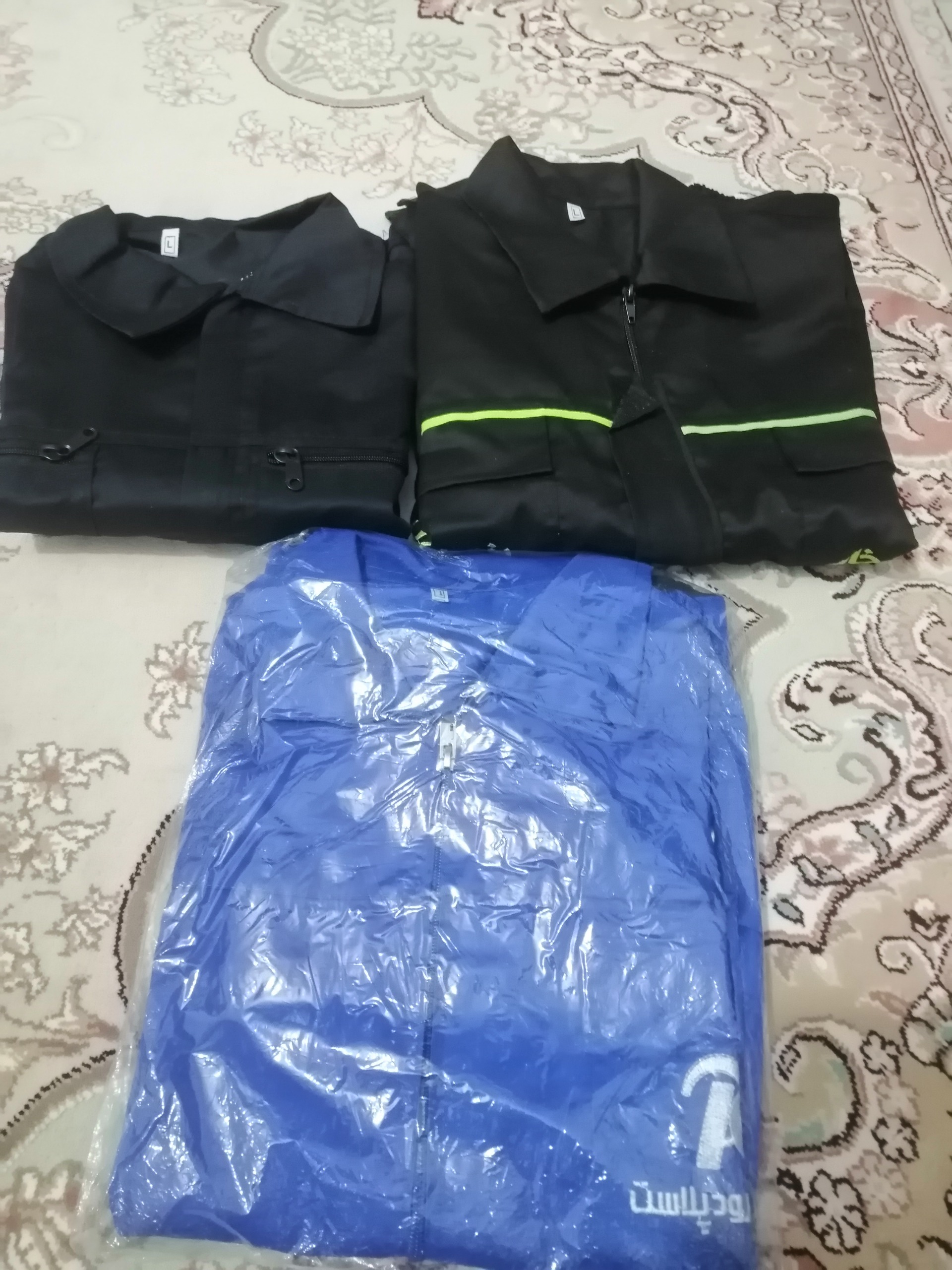 لباس کار نو نو آرم تبلیغاتی پشتشون هست اون تصویر تکی مدیوم هست اون سه تا مشکی لارج واون سه تا آبی
