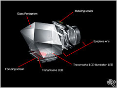 منظره یاب تعبیه شده در قسمت بالای LCD با قابلیت پوشش دهی صد در صد و بزرگنکایی 1.0x :