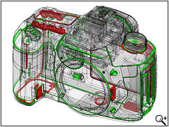درزگیری محیطی : دوربین دارای درزگیری آب و هوایی مشابه مدلEOS 1N (1994) می باشد. نقاط قرمز در تصویر، نقاط درزگیری شده می باشند و نقاط سبز، نقاط تقویت شدهی بدنه ی منیزیمی را نشان می دهند.