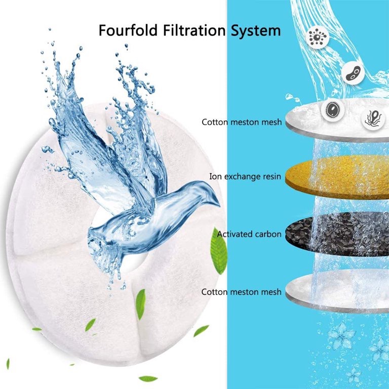 هر فیلتر از کربن فعال، رزین تبادل یونی و پارچه نبافته تشکیل شده است. آنها میتوانند مو و فلزات سنگین را فیلتر کرده و طعم آب را بهبود بخشند تا حیوانات خانگی بتوانند در تمام طول روز آب تمیز و تازه بنوشند، که به افزایش مصرف آب و کاهش خطر عفونتهای دستگاه ادراری کمک میکند.