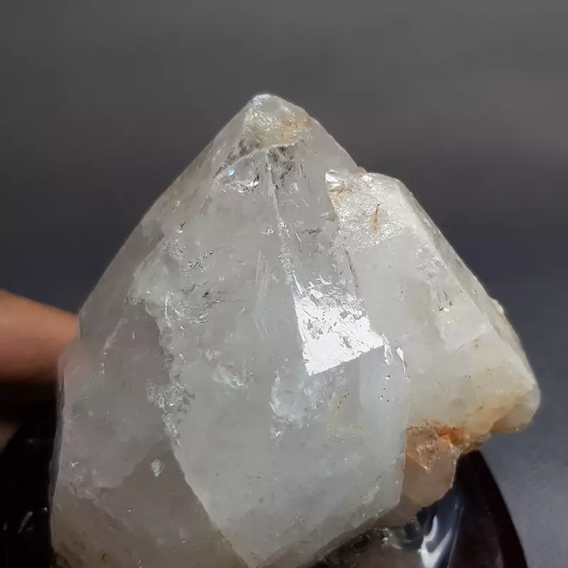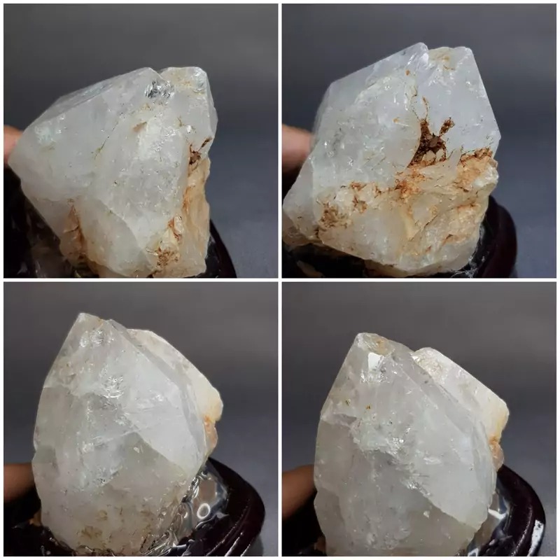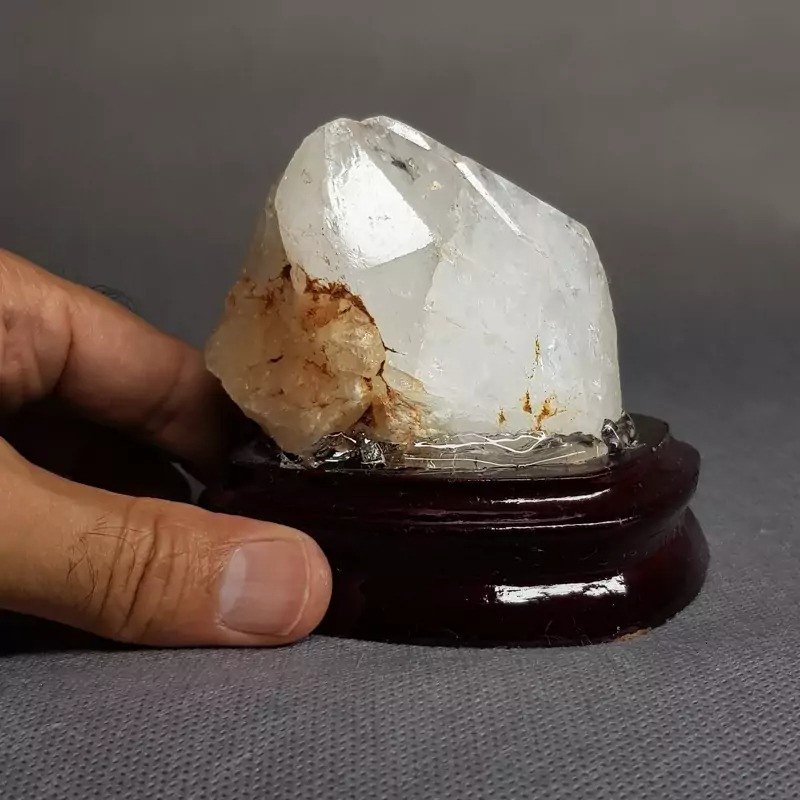 یک قطعه بلور سنگ کوارتز دو سر با شکل طبیعی هندسی یخی و نیمه شفاف از معادن افغانستان نصب شده روی پایه چوبی نفیس