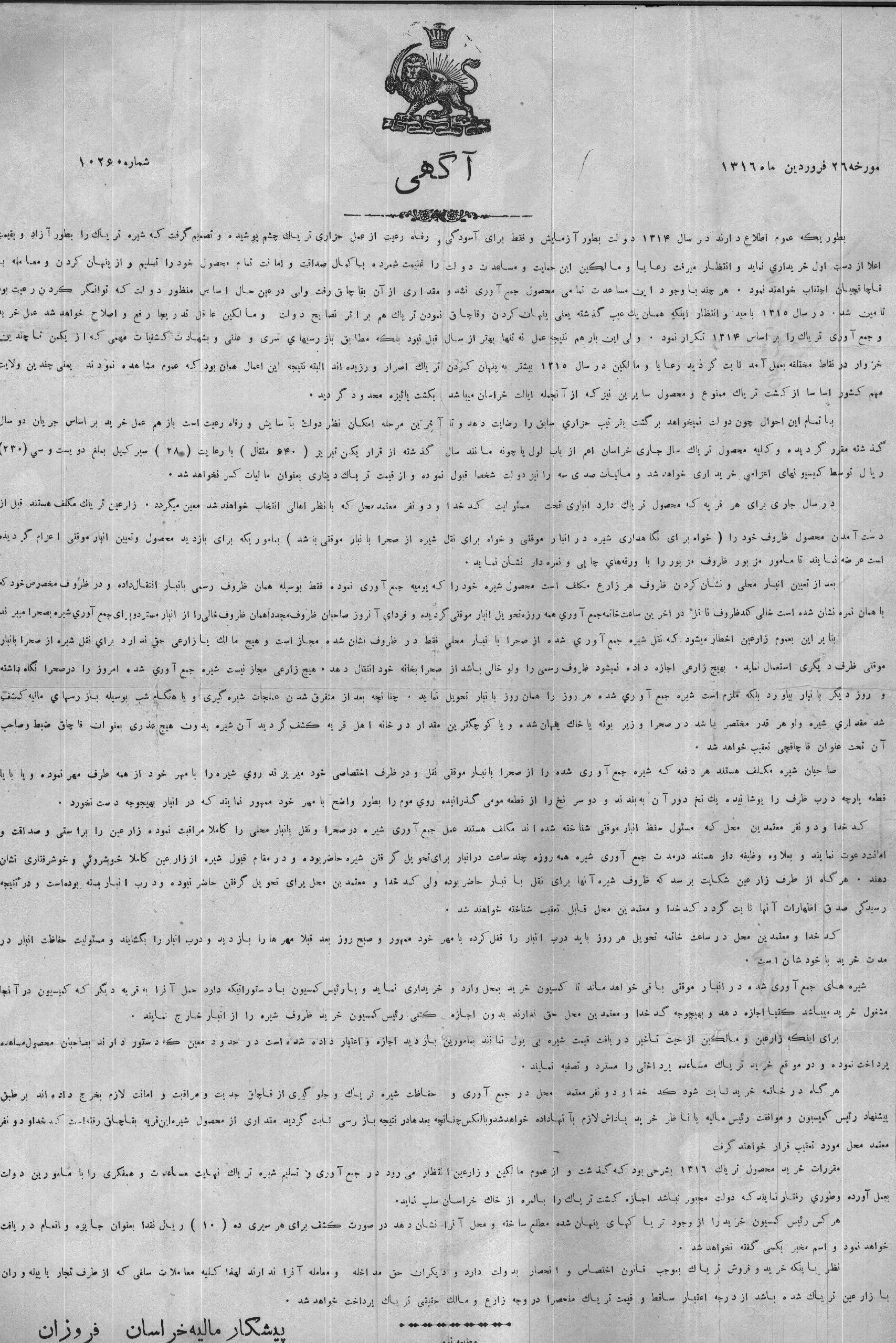 آگهی مربوط به خرید محصول شیره کشت تریاک در فروردین سال 1316 در منطقه خراسان بوده و در پشت آن نیز عبارت { ملزومات و اثاثیه کمسیون} و همچنین عدد {11} با خودنویس نوشته شده است