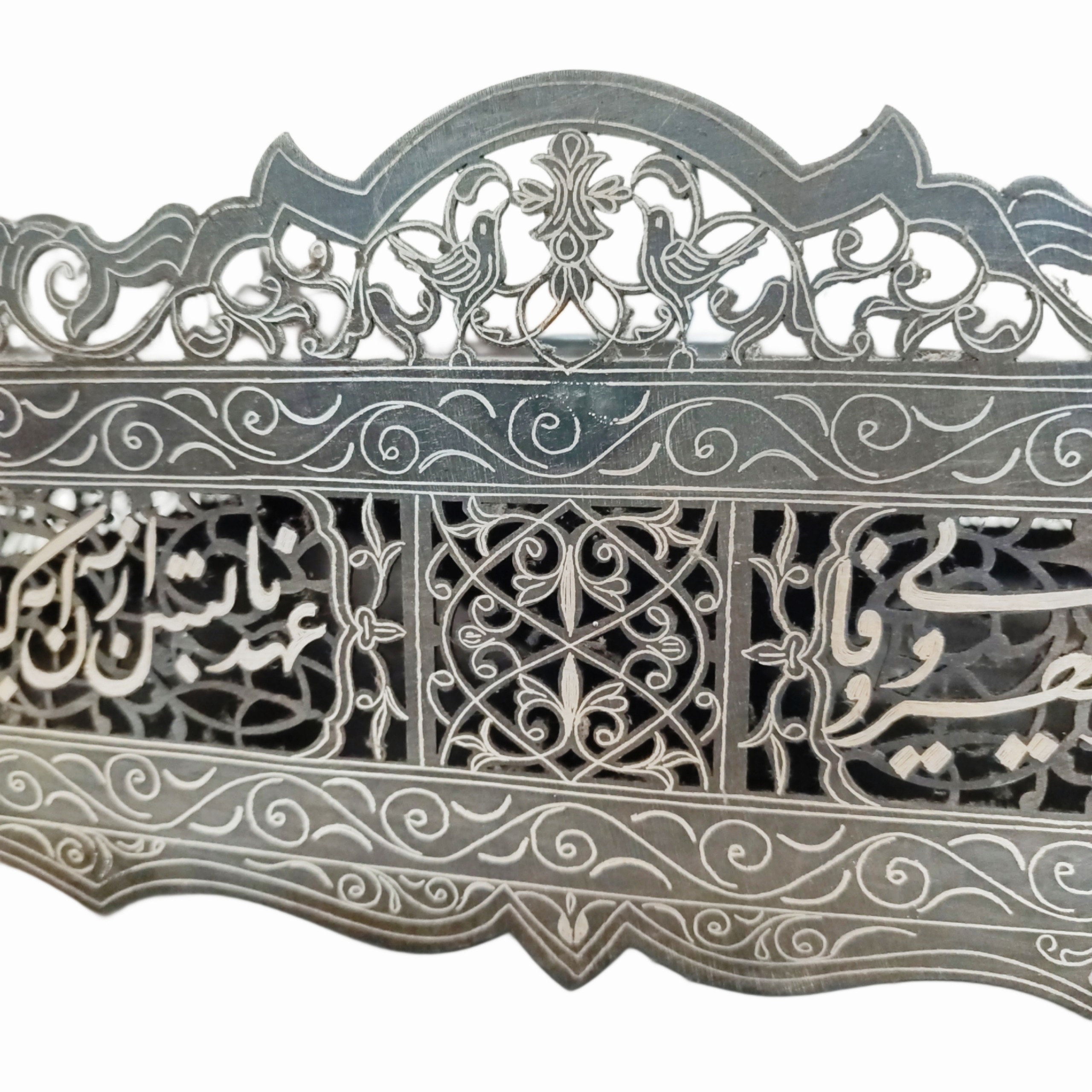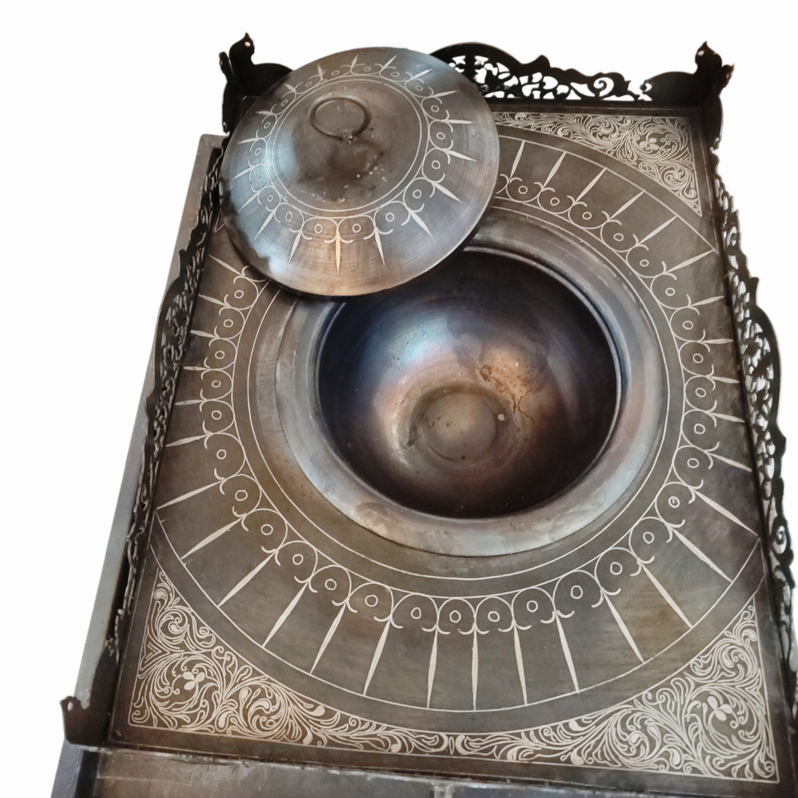 منقل ذغالی از جنس فولاد و روی آن نقره کوبی شده است. مشبک کاری های روی منقل زیبایی خاصی به آن میدهد. دور تا دور منقل شعر نویسی همراه با گل و بوته و نقره کوبی وجود دارد.