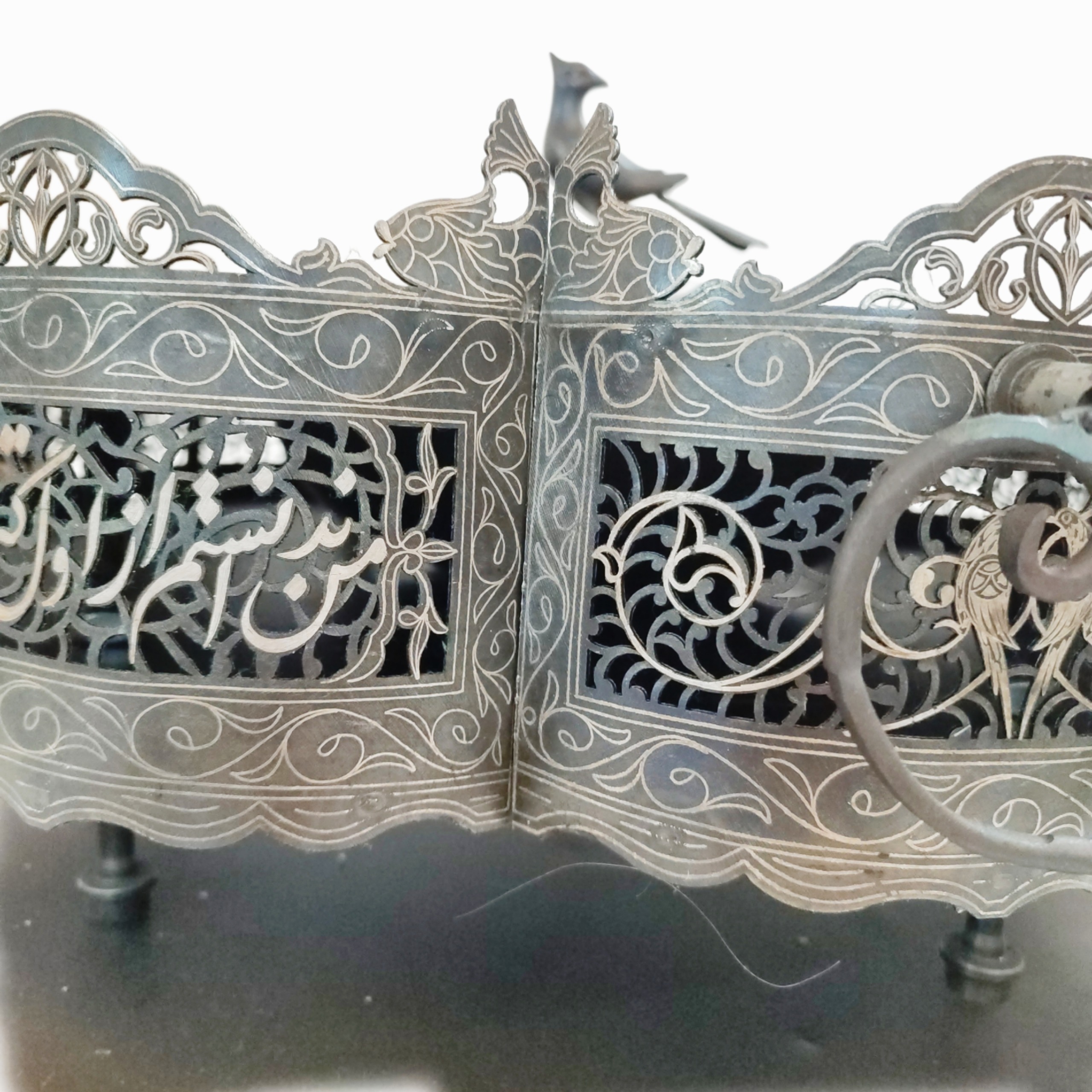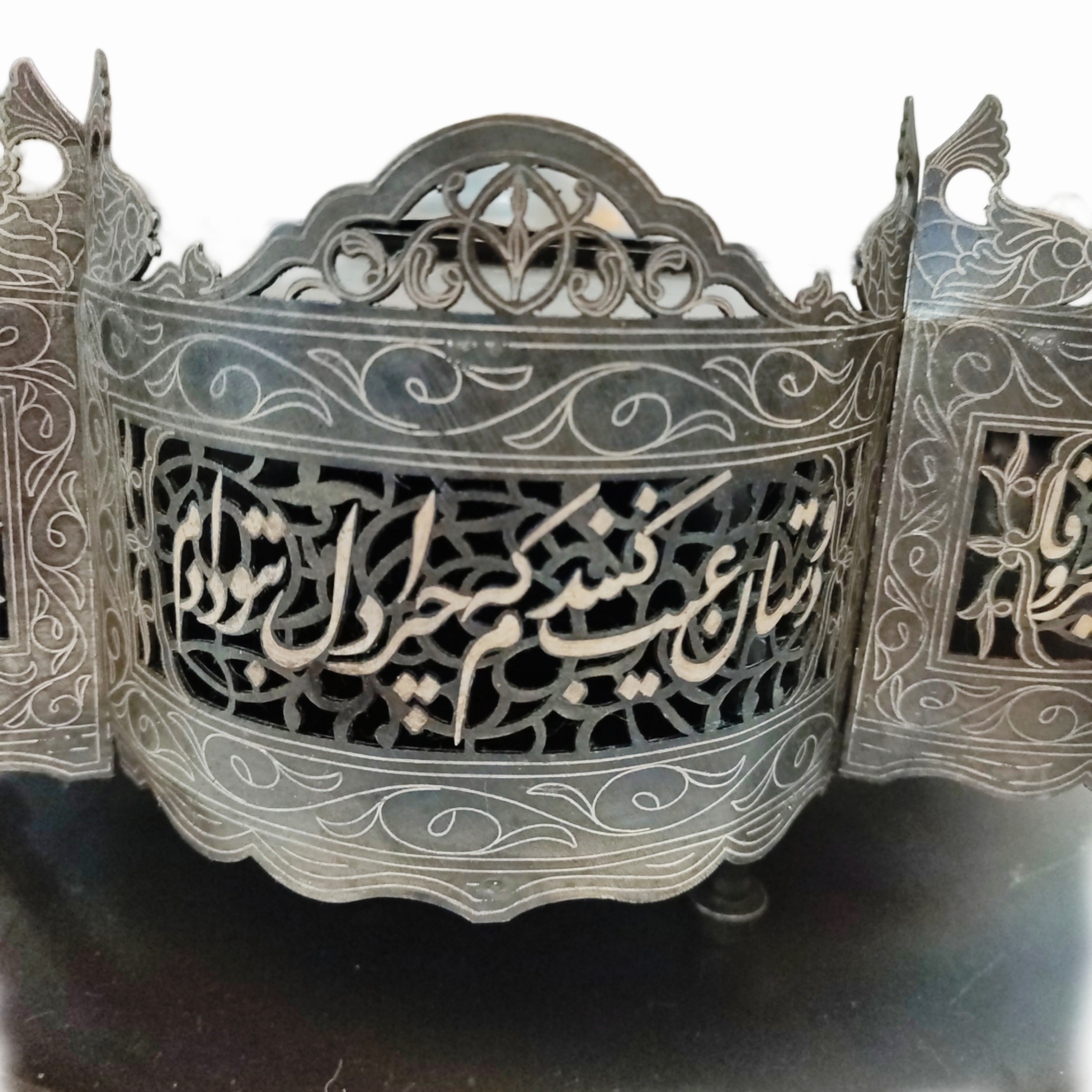 منقل ذغالی 10 پر و از جنس فولاد میباشد و روی آن نقره کوبی شده است. مشبک کاری های روی منقل زیبایی خاصی به آن میدهد. دور تا دور منقل شعر نویسی همراه با گل و بوته و نقره کوبی وجود دارد.