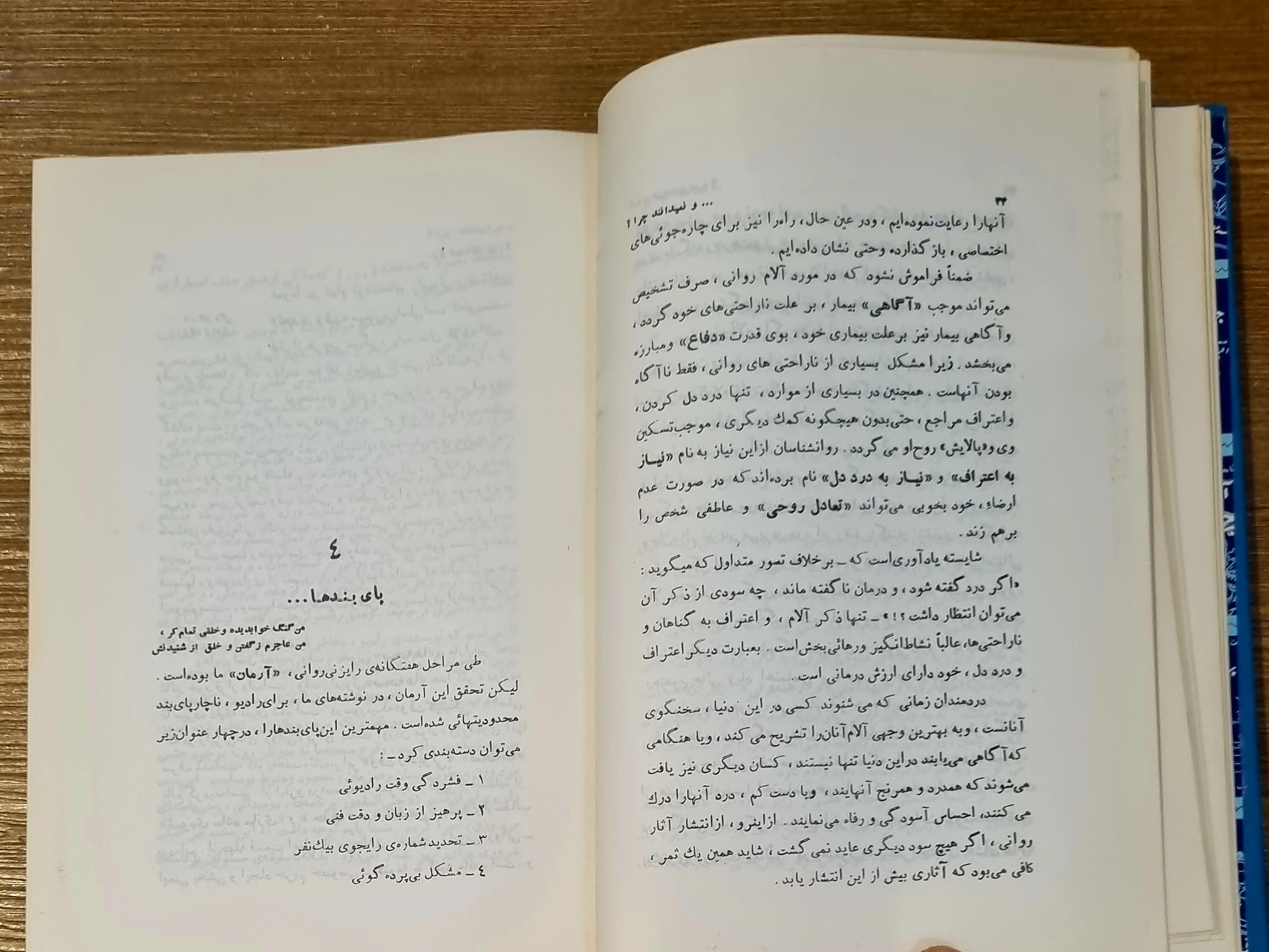در بخش اول کتاب به علل مسائل و مشکلات روانی, شیوههای درمان و پیشگیری اشاره شده و در بخش دوم, گفت و گوهای میان بیمار و روانپزشک ـ درباره مسائلی که منشا روانی دارند ـ به طبع رسیده است .