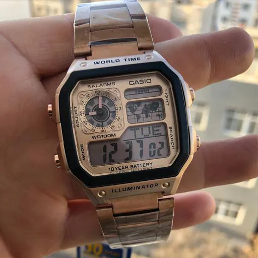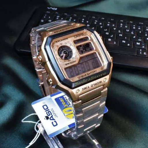 کاسیو جهان نما ،، سوپر فول امکانات ،، کلا رزگلد یا مسی روشن با حلقه مشکی 8 گوش دور شیشه ،،
