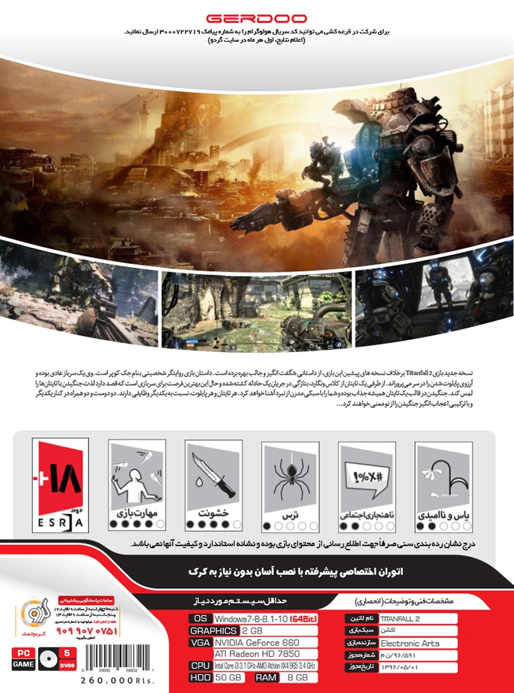 سقوط تیتان 2 یک بازی در سبک اکشن و تیراندازی اول شخص است که توسط Respawn Entertainment توسعه یافته و در سال 2017 توسط EA برای پلتفرم PC عرضه شده است بازی دربارهی رباتهایی غولپیکر است که ظاهراً دارای هوش مصنوعی بسیار قوی هستند و هرکدام ویژگیهایی مخصوص به خوددارند. وقایع بازی در آیندهای دور اتفاق میافتد و داستان با صحبت بین Tai Lastimosa و Jack Cooper در نیروی شبه نظامی (Militia) آغاز میشود، جاییکه کاپیتان لاستیموسا با دیدن استعداد جک کوپر تصمیم میگیرد به او آموزش نظامی لازم برای پایلوت شدن و در حقیقت زنده ماندن در نبردها را بدهد اما در ادامه اختلافات بین Militia و IMC بر سر اراضی فرانتیر باعث به وجود آمدن جنگی بزرگ در زمان آینده میشود.