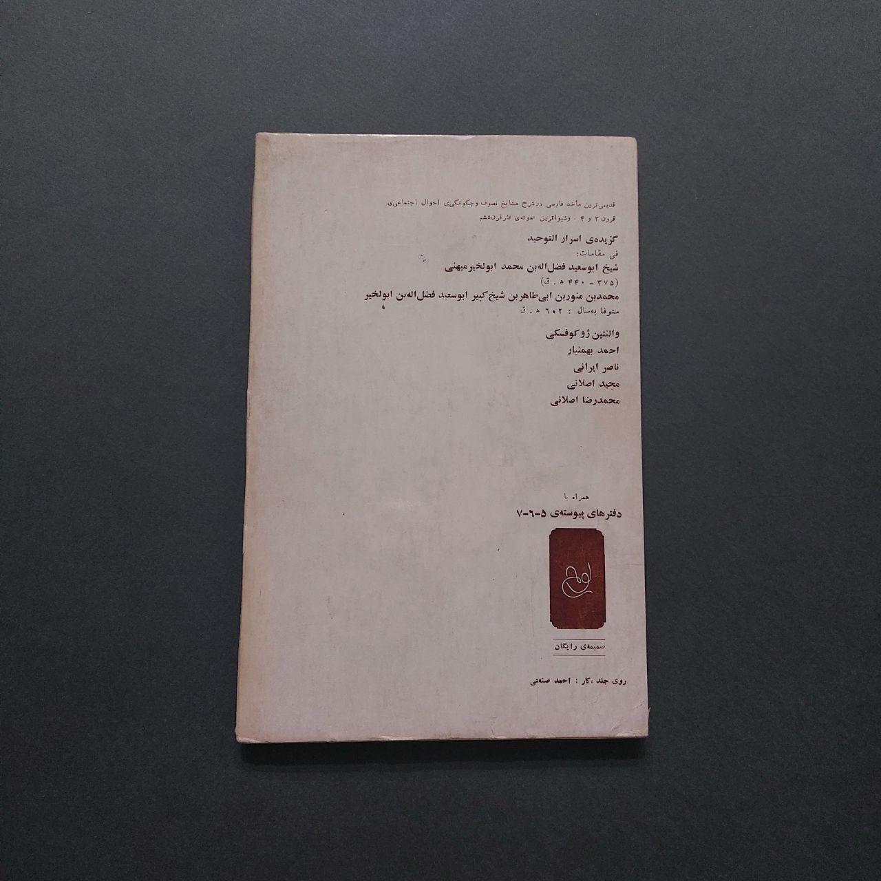 روی جلد،پشت و عطف جلد کتاب بدلیل قدیمی بودن کتاب ممکن است دارای لکه ،زدگی،فرورفتگی در لبه ها وجود داشته باشد.