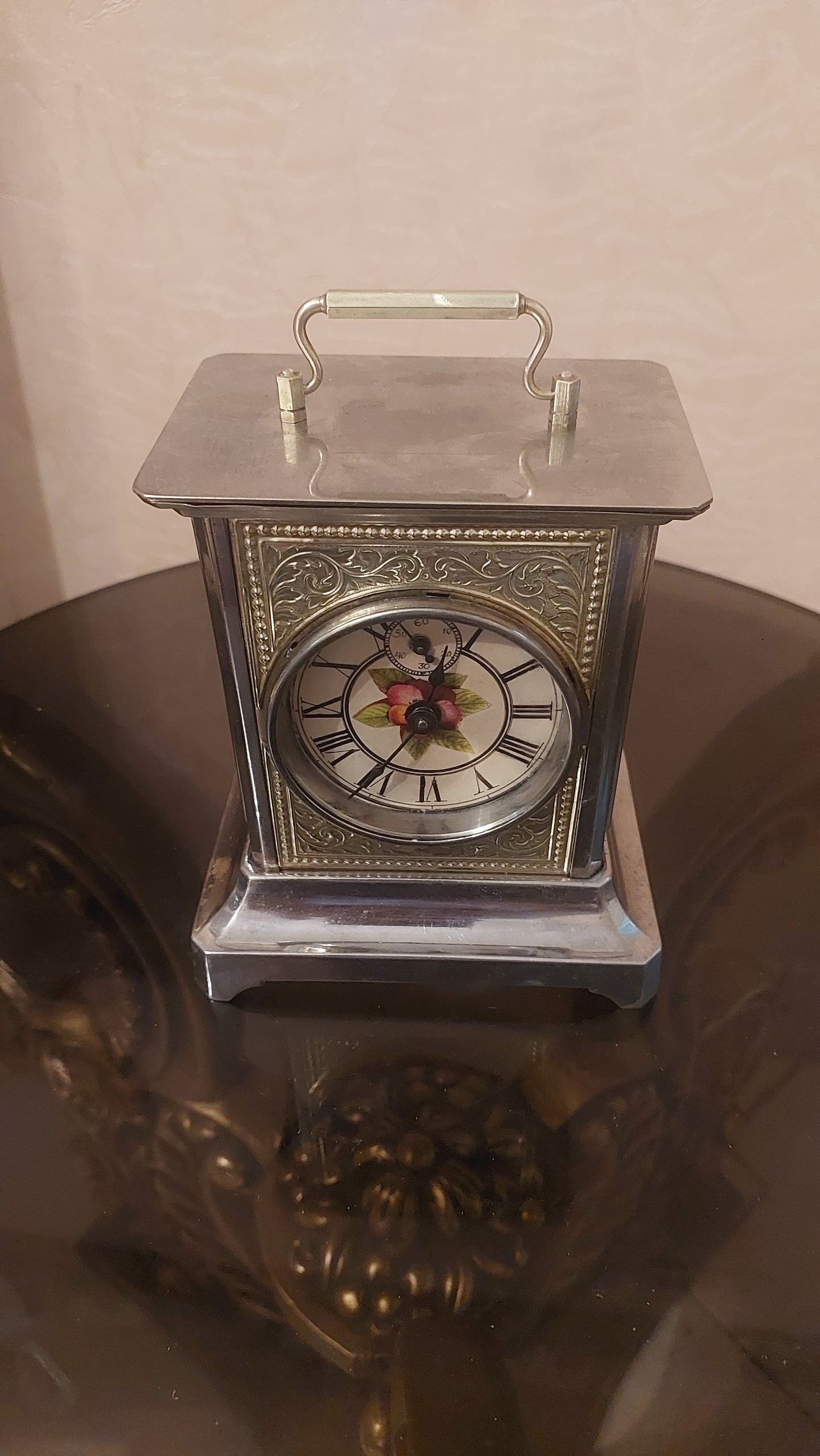 ساعت کوکی رومیزی قدیمی دوستان ساعت بصورت کلید کوک میباشد که کلید پشت درب عقب هستش دارای الارم ساعت صحیح وسالم درحال کار کردن ارتفاع ساعت حدود20 سانتیمتر طول کار حدود14 سانتیمتر هستش