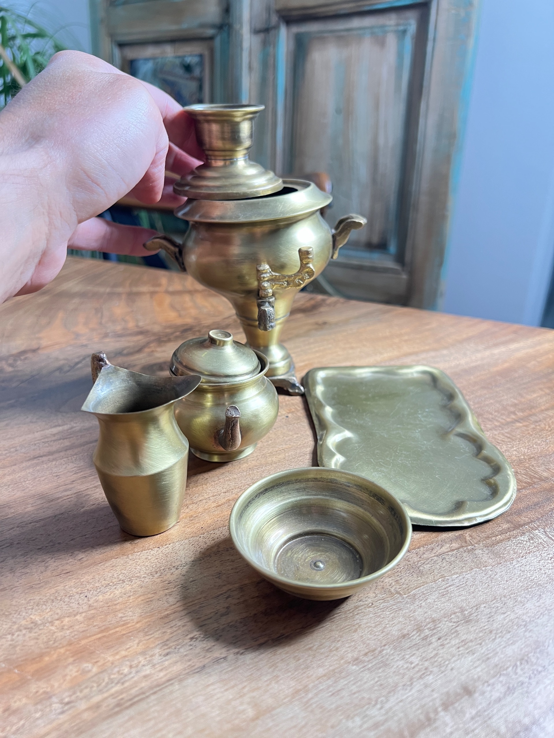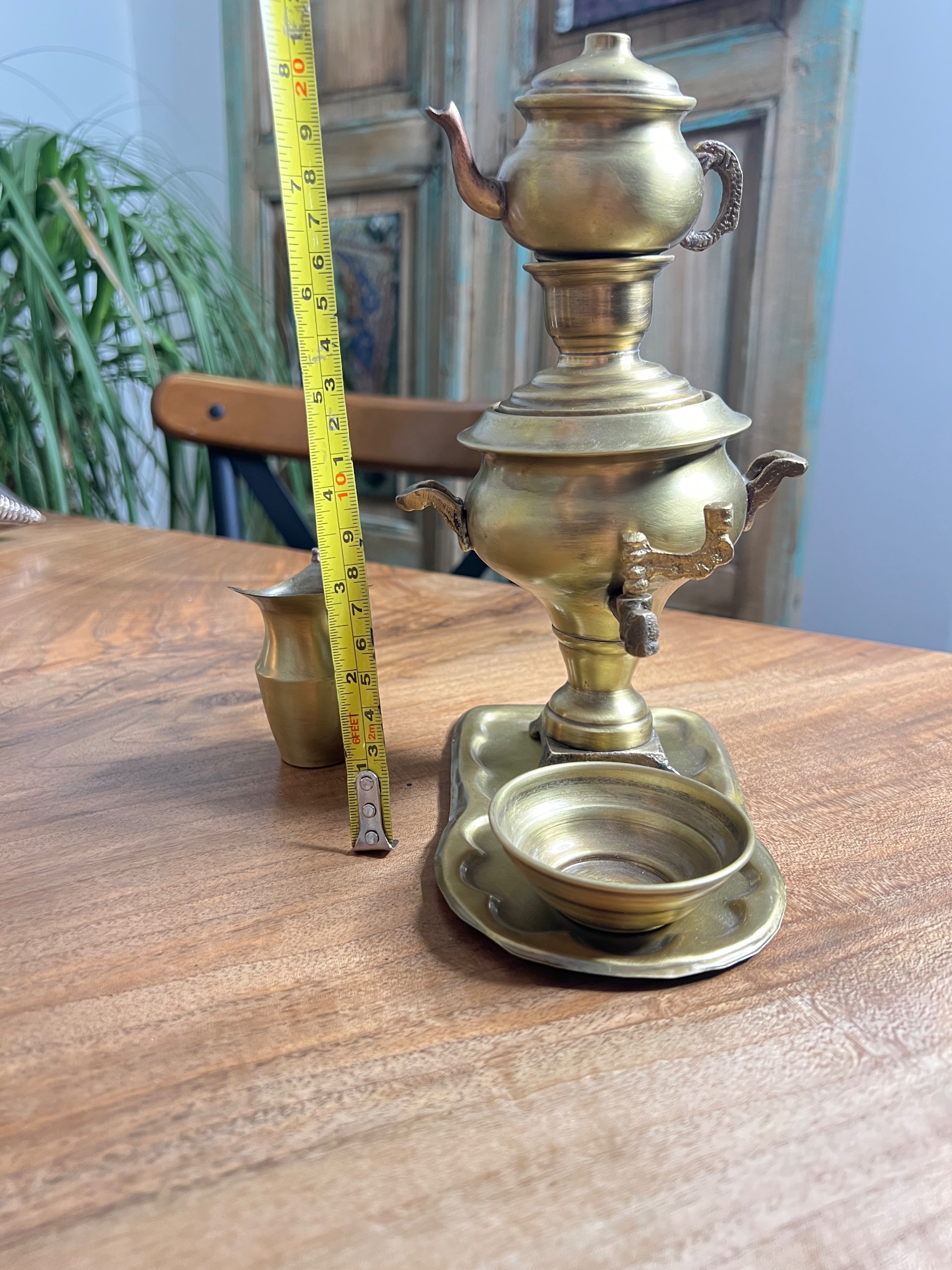 سماور مدل ذغالی مینیاتوری با سرویس کامل سینی و قوری و جوم و پارچ مناسب دکور ارتفاع با قوری 20 سانت