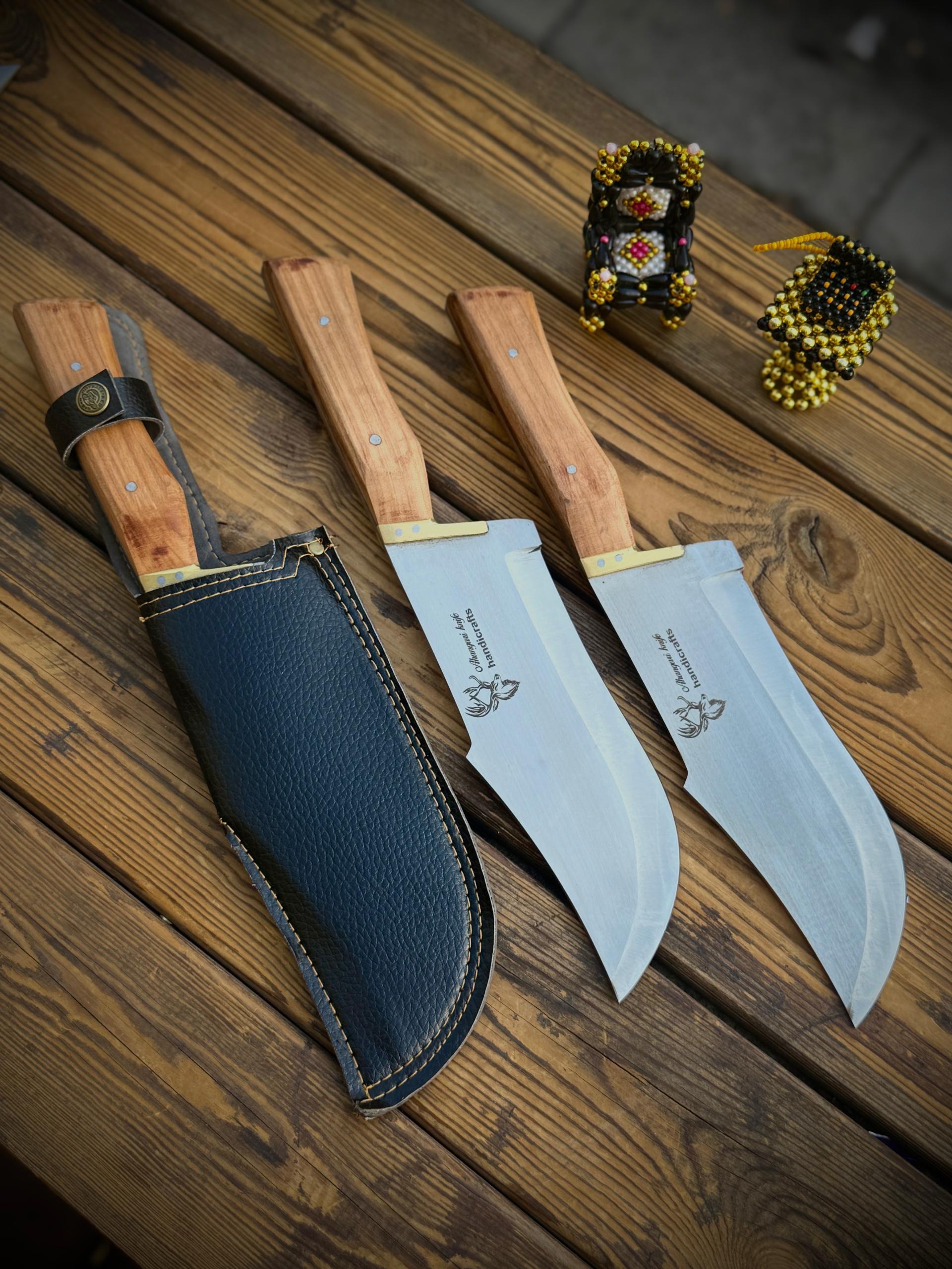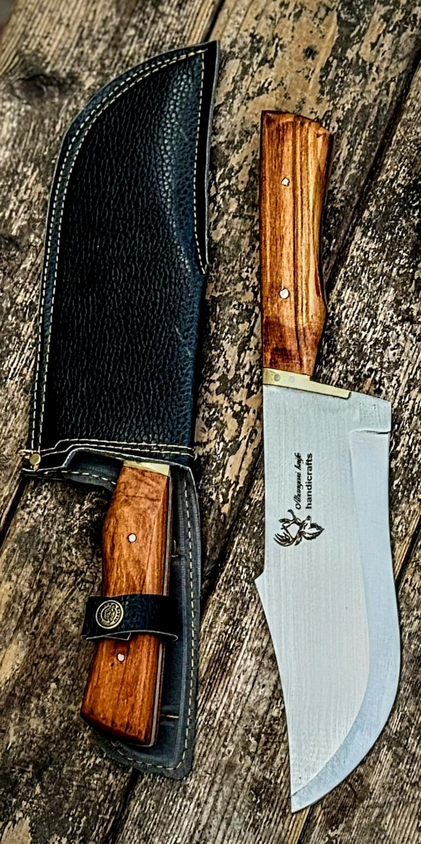 چاقو شکاری دسته چوب گردو تیغه فولاد آلمانی آبدیده تیز وبرا همراه غلاف باربند برنجی سایز 27سانت قیمت مناسب سایزکوچکترنیز موجود میباشد