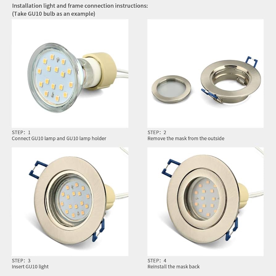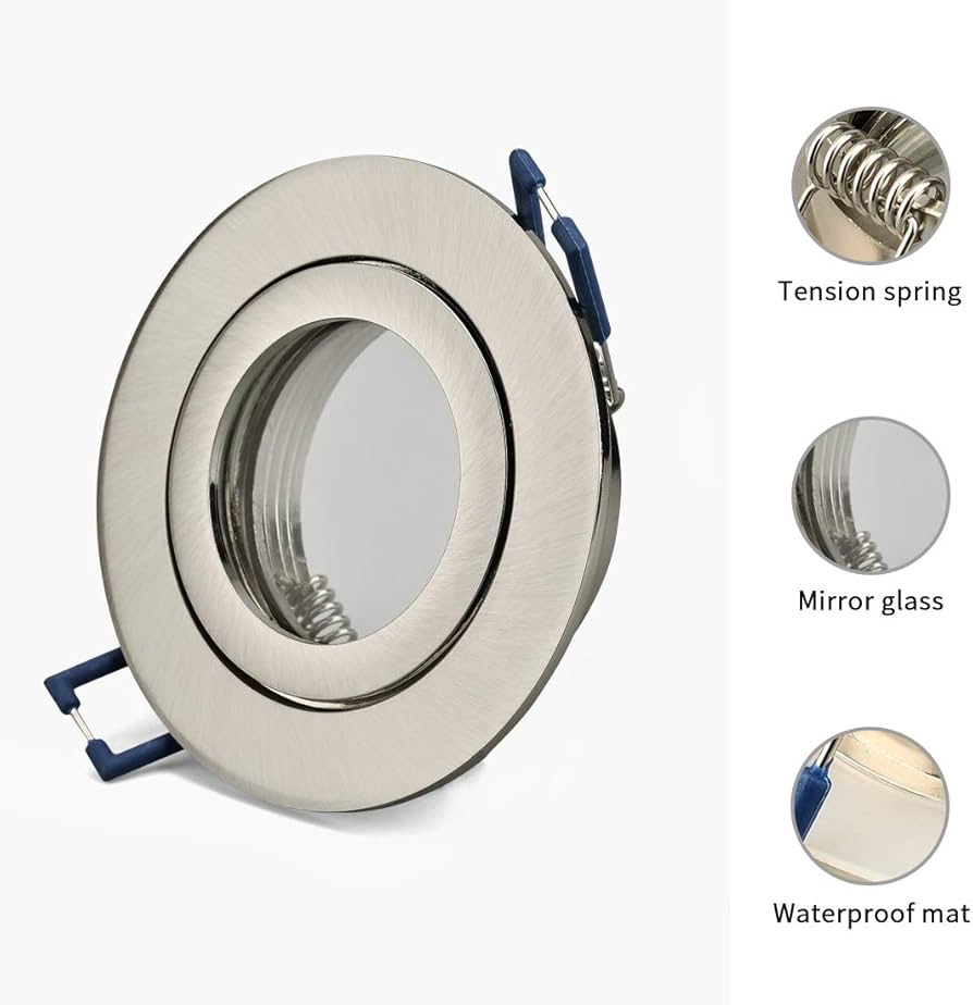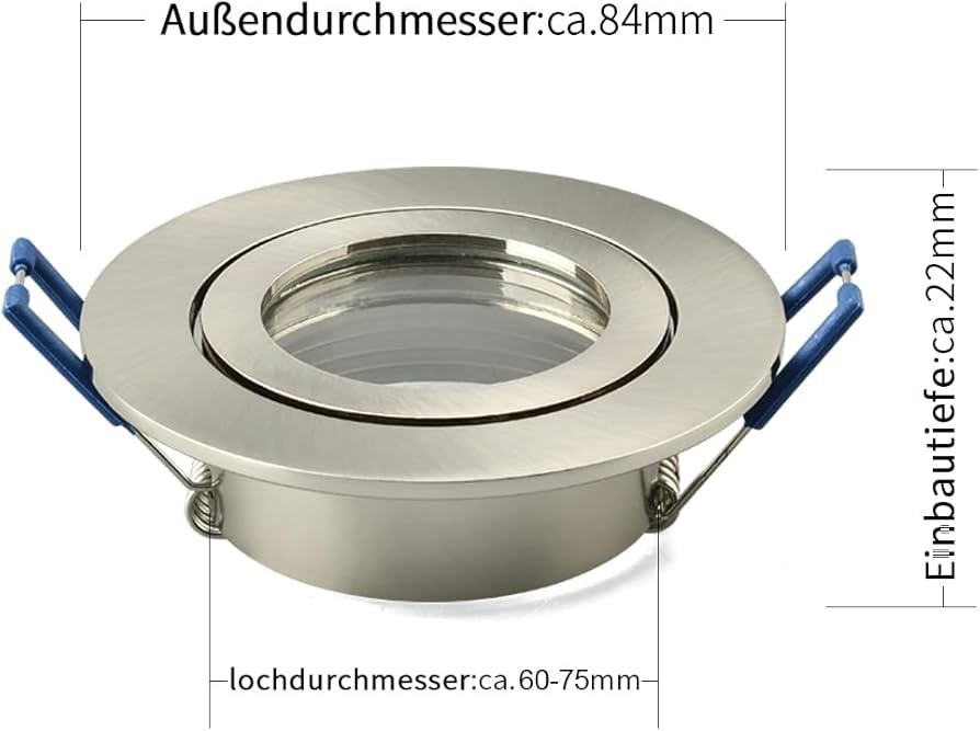 قطر خارجی: 84 میلیمتر، قطر سوراخ 60-75 میلیمتر، عمق نصب: 28 میلیمتر. مناسب برای لامپهای هالوژن یا سایر لامپهای GU10 و ماژولهای LED (بدون لامپ).
