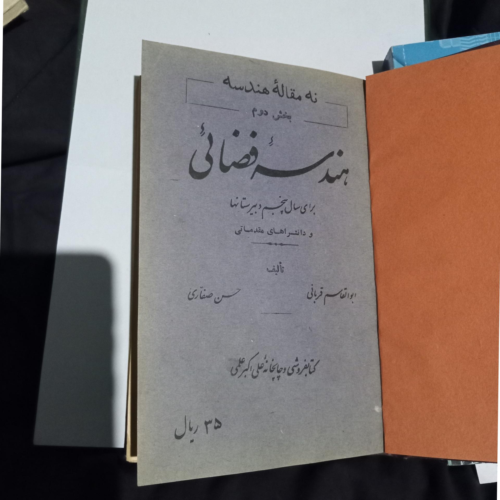 نه مقاله هندسه - بخش دوم - هندسه فضائی - برای سال پنجم دبیرستانها و دانشسراهای مقدماتی - شامل مقاله پنجم و ششم و هفتم مصوب شورای عالی فرهنگ - چاپ هشتم -چاپ تهران نشر کتابفروشی علی اکبر علمی -، رقعی - گالینگور - 211 ص -