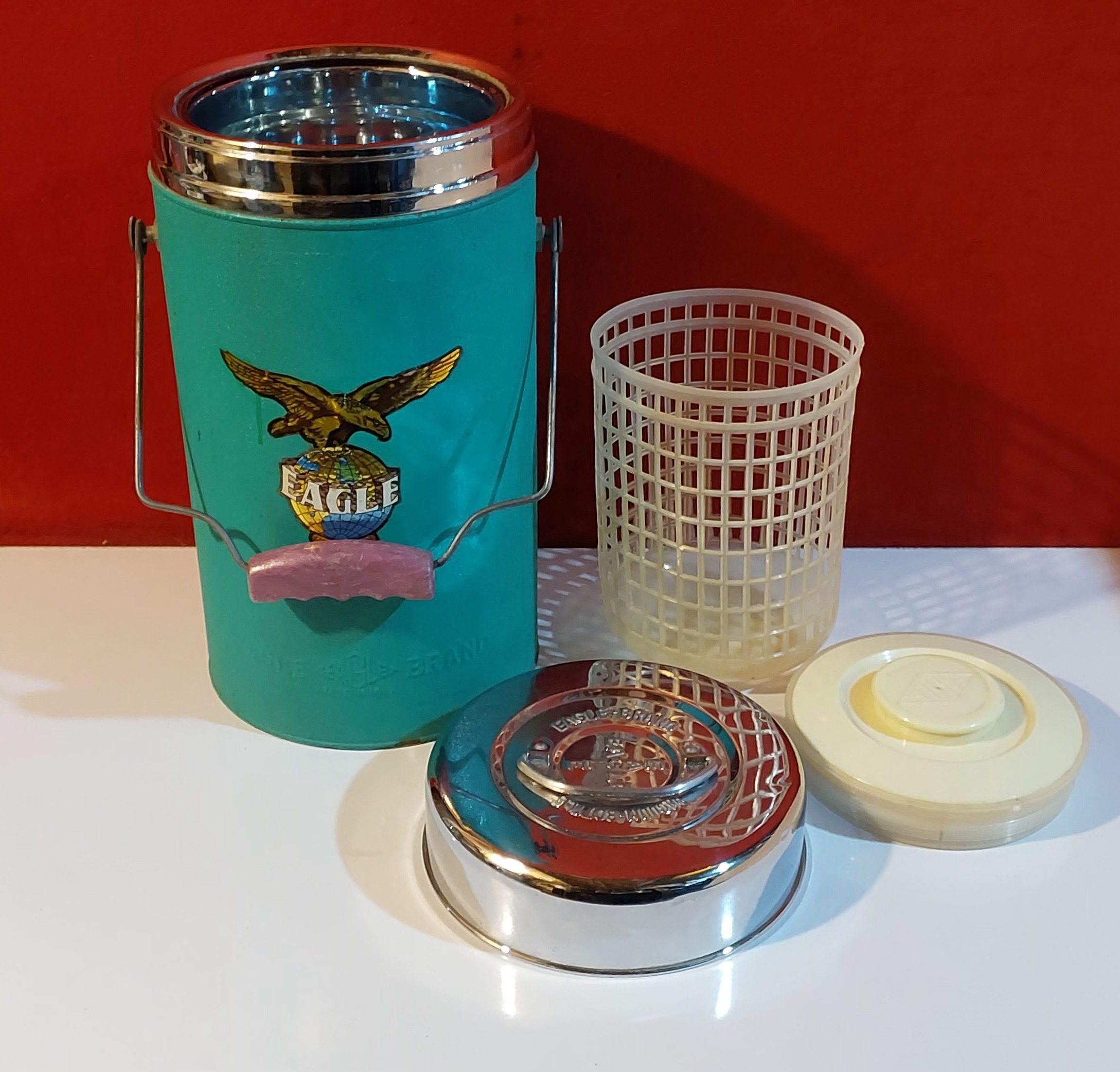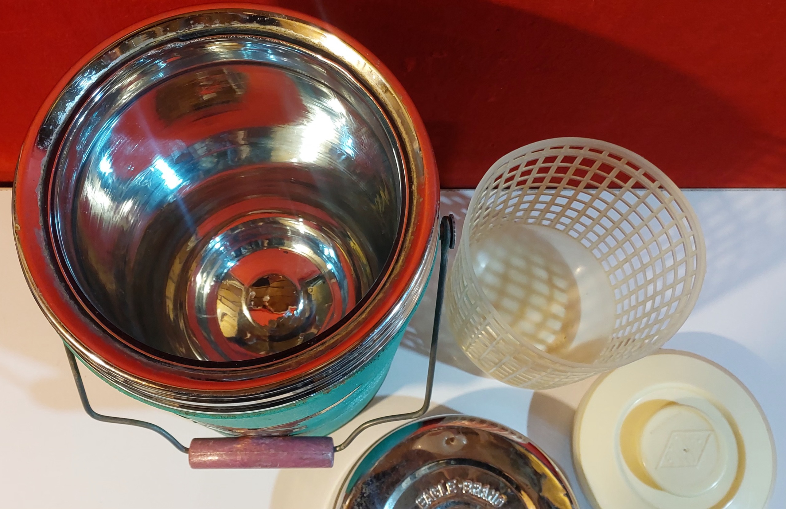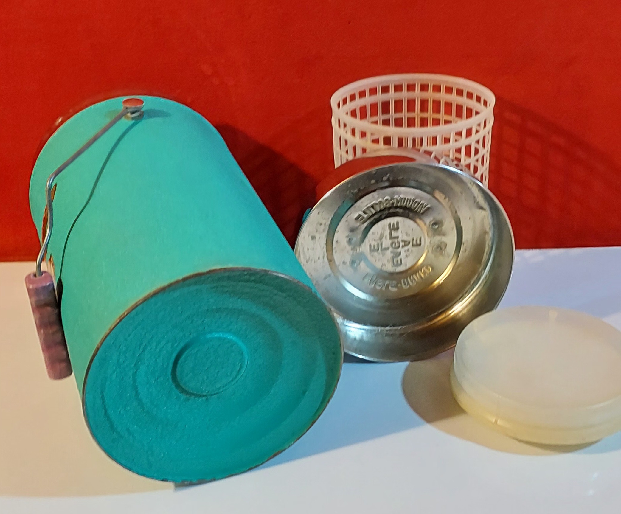 ساخت قدیم کشور ایران برند عقاب معتبر با رنگ سبزآبی خاص فلزی مقاوم سالم تمیز فقط یکم بخاطر قدمتش بو دارد که با شستن برود ؛  طبق تصاویر لطفا دقت فرمائید.