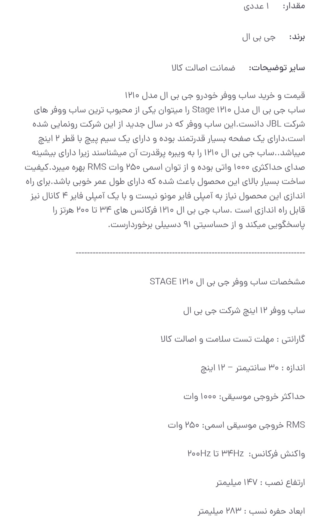 ساب ووفر خودرو جی بی ال مدل1210 فووول و جدیدترین